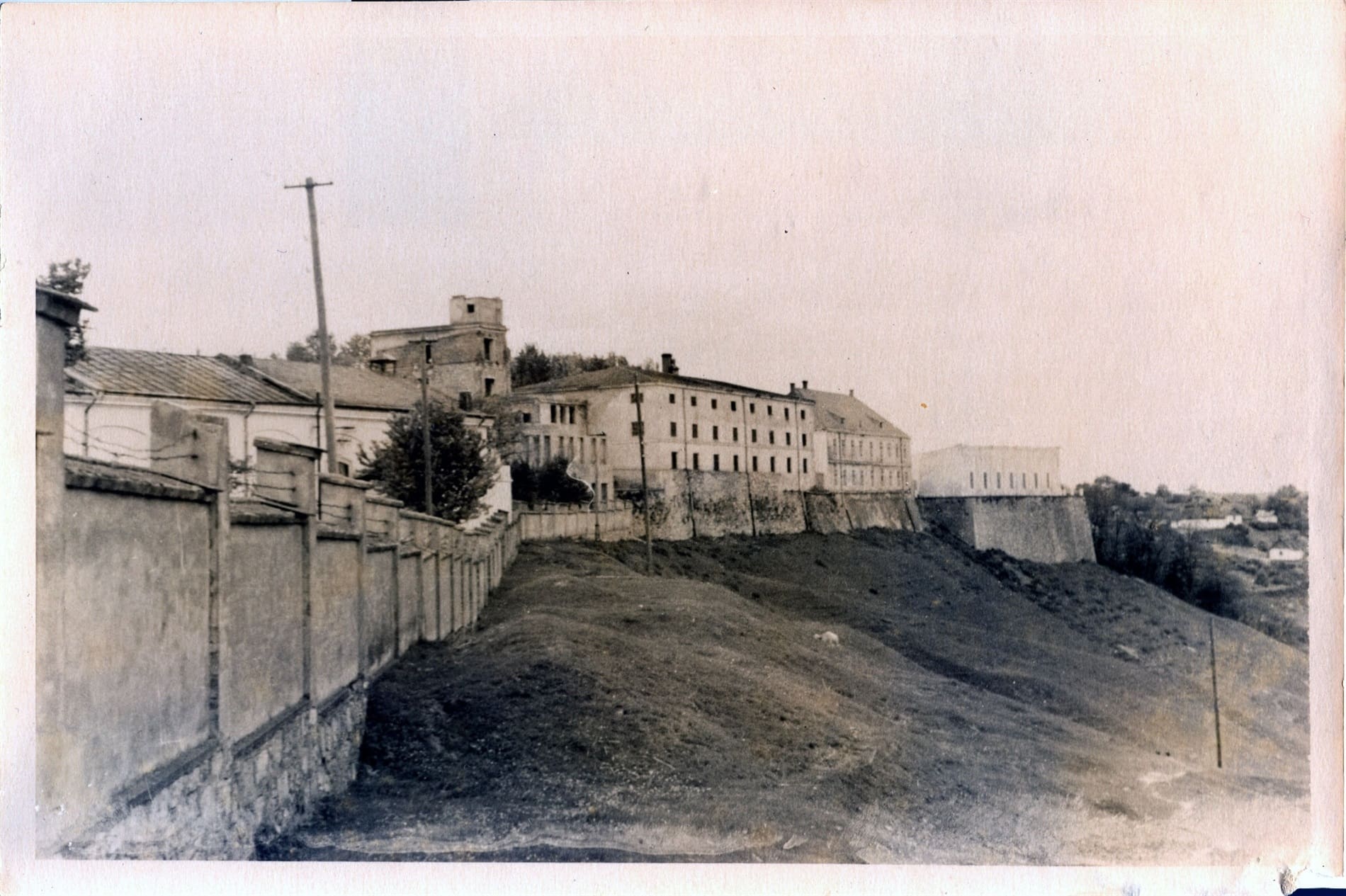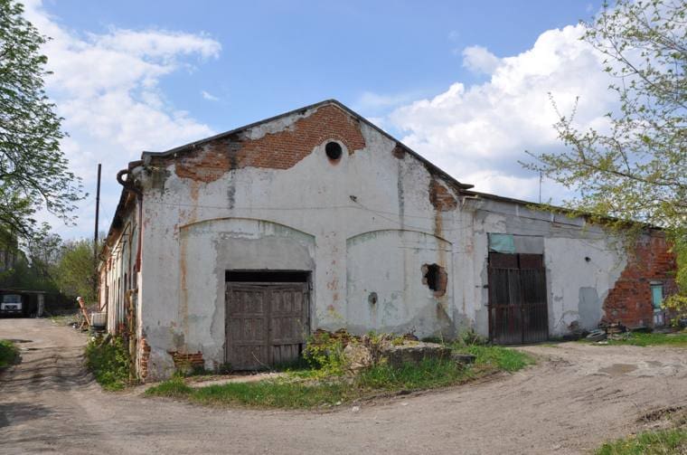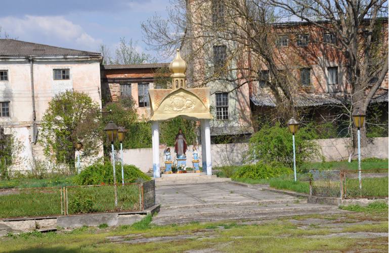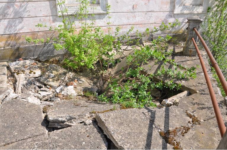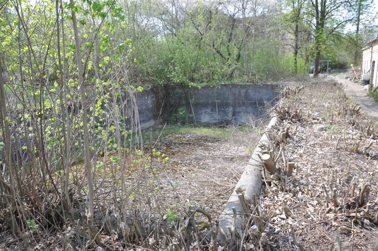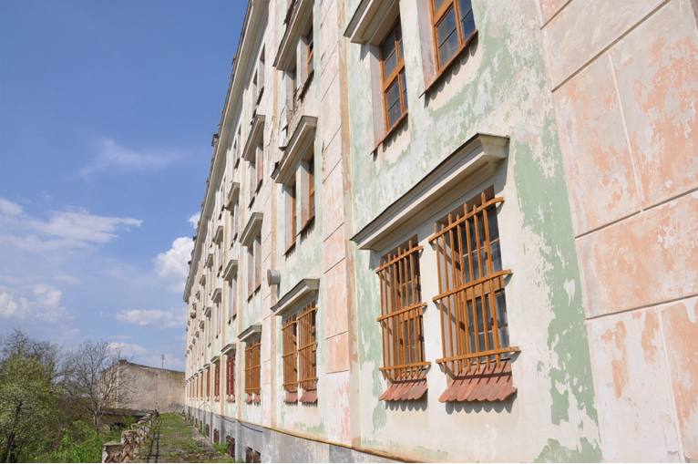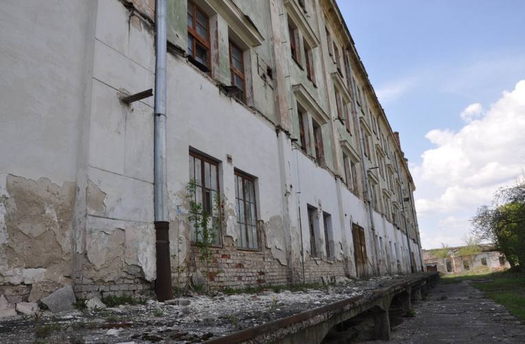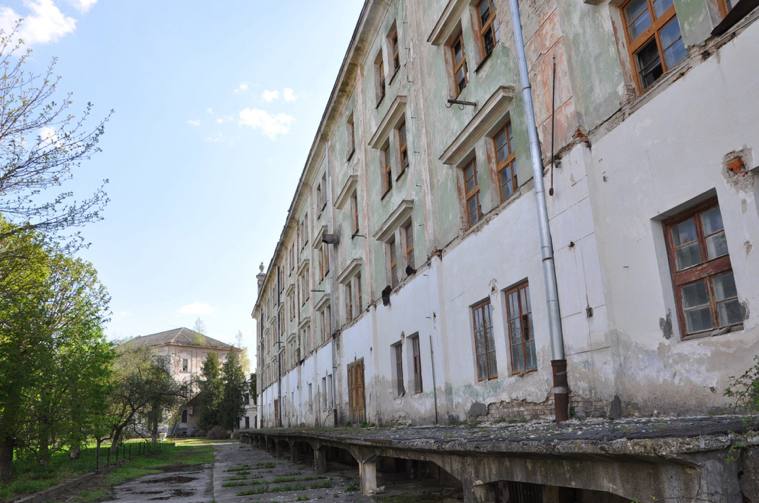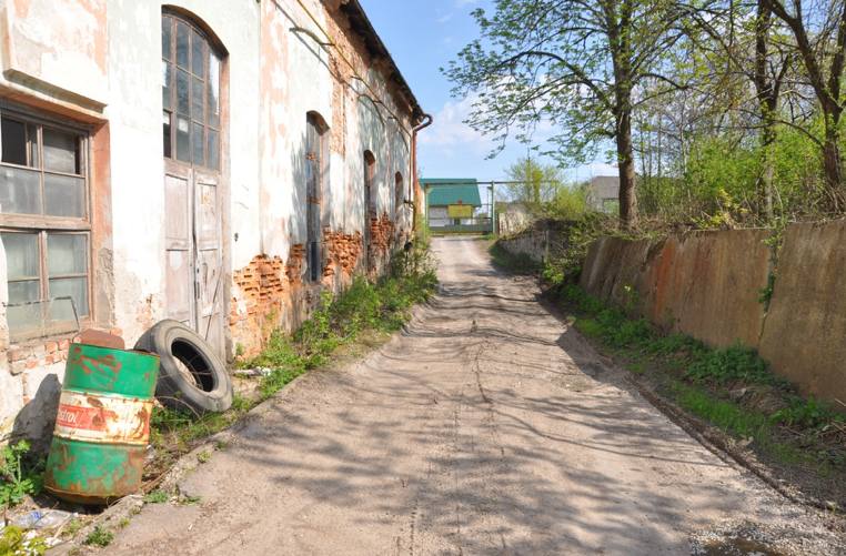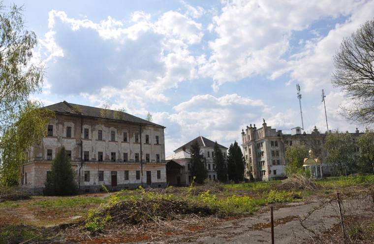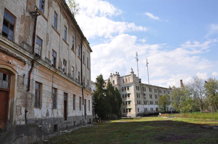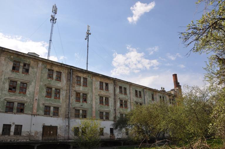 З нашим «гiдом» Мирославом Йосиповичем ми потрапили на територiю з тильної сторони через зруйновану огорожу. Густi зарослi рослинностi, занедбанi пiдсобнi примiщення з аркоподiбними вiкнами, з усього видно, збудованi ще за Австрiї, з полишеним всерединi рiзним смiттям.