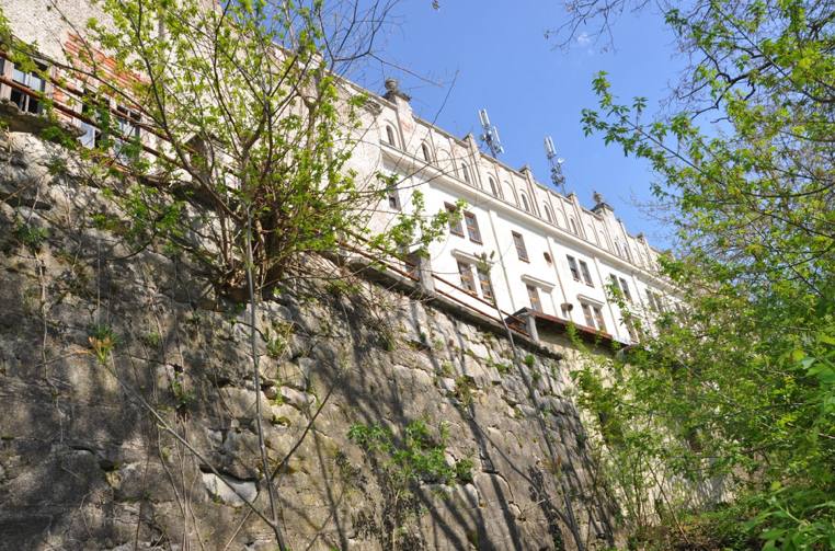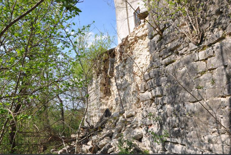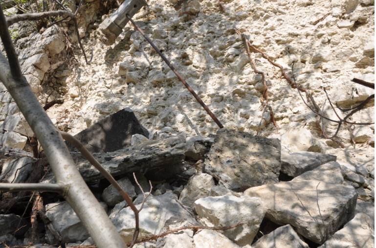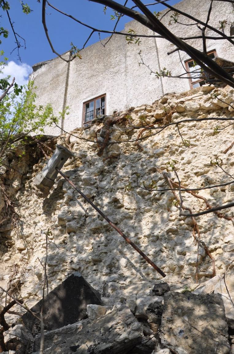 Обiйшовши територiю замку по периметру, пробираючись крiзь густi колючi зарослi акацiй i купи викинутих скляних пляшок та рiзного смiття (це вже окреме питання до мiсцевих мешканцiв щодо їхнього недбалого ставлення до навколишнього середовища – авт.), ми пробралися до товстелезних мурiв твердинi з пiвденної сторони, попередньо будучи обiзнанi, що десь у тому мiсцi вона зазнала руйнацiї. На жаль, так воно i є… Великий шмат кiлькаметрової стiни не витримав випробування часом i людською байдужiстю, потягнувши за собою додолу й кований карниз тераси.