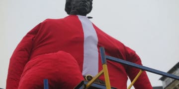 На монумент одягнули червоний плащ, поруч поставили мішок із подарунками. Поки фінський Санта ще без шапки, та вже до кінця дня тернопільського Пушкіна уберуть повністю.