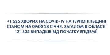Згідно з даними обласного центру контролю та профілактики хвороб станом на ранок 28 січня зафіксовано 1625 нових випадків захворювання на коронавірус.