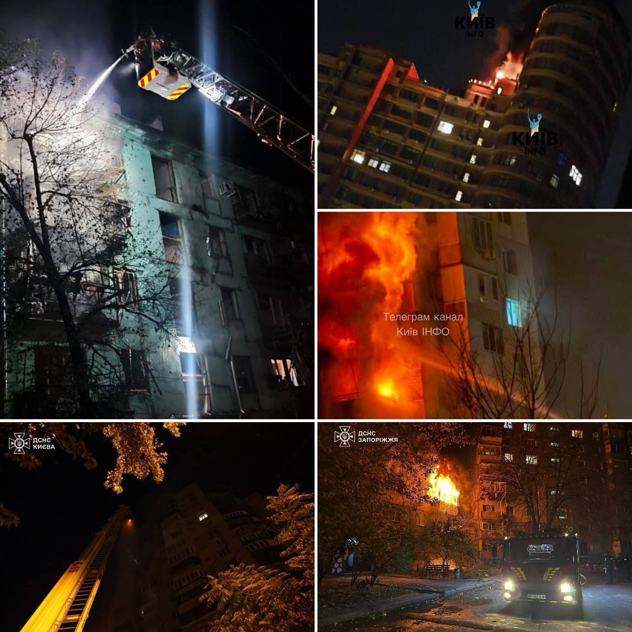 Київ. Влучання зафіксовано у шести районах столиці, там пошкоджено багато житлових будинків. Відомо про 2 загиблих і 2 постраждалих. Обломки БПЛА упали на будівлю гуртожитку.