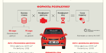 Наприклад, оформлення авто 2011 року випуску з бензиновим двигуном об’ємом 1600 см³ коштуватиме 560 євро. (50 євро х 1,6 (1600 см3/1000) х 7 років = 560 євро)
