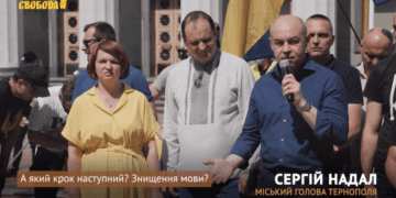Деталі. У виступі перед побратимами під час акції міський голова Тернополя Сергій Надал наголосив, що ревізія мовного законодавства — це реалізація московського сценарію, а найбільша загроза для України — це російський реванш в Україні.