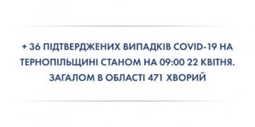Згідно з даними обласного лабораторного центру станом на 09:00 22 квітня на Тернопільщині 471 випадок COVID-19, 7 – летальних