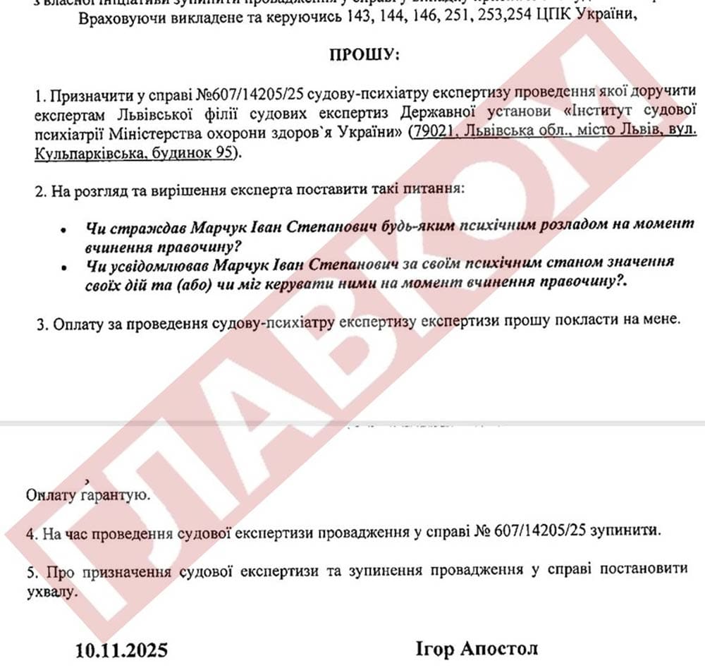 10 листопада до Тернопільського міськрайонного суду надійшло клопотання у справі за позовом Марчука. Його автором став Ігор Апостол, один із підписантів ліцензійного договору. У документі відповідач ініціює проведення судово-психіатричної експертизи Івана Марчука.