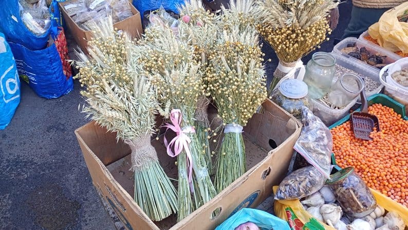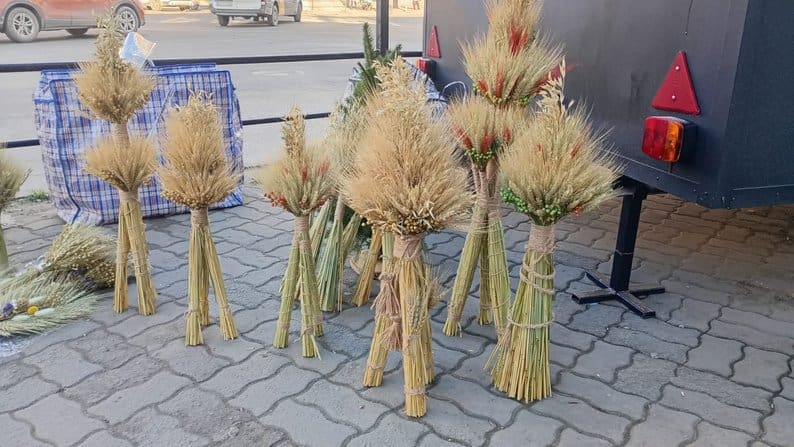 Продавчиня Світлана розповіла, що для виготовлення дідуха використовують різні злаки — жито, пшеницю, овес, льон. За її словами, традиційно дідух складається з трьох ярусів, які символізують минуле, теперішнє і майбутнє покоління родини.
