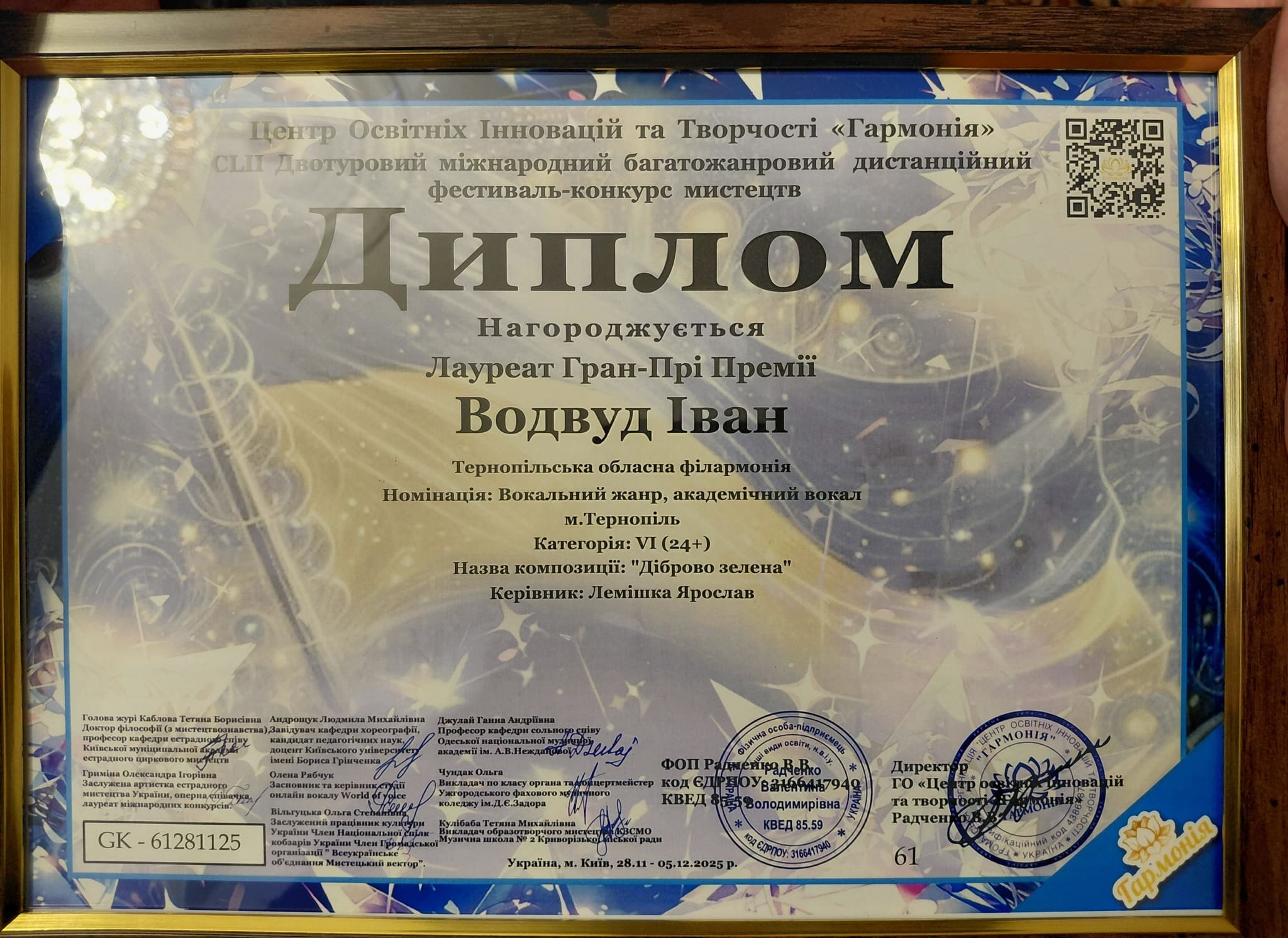 Тернопільська обласна філармонія з гордістю повідомляє: соліст академічного камерного оркестру Іван Водвуд став володарем Гран-Прі Міжнародного багатожанрового фестивалю-конкурсу мистецтв від Центру Освітніх Інновацій та Творчості «Гармонія».