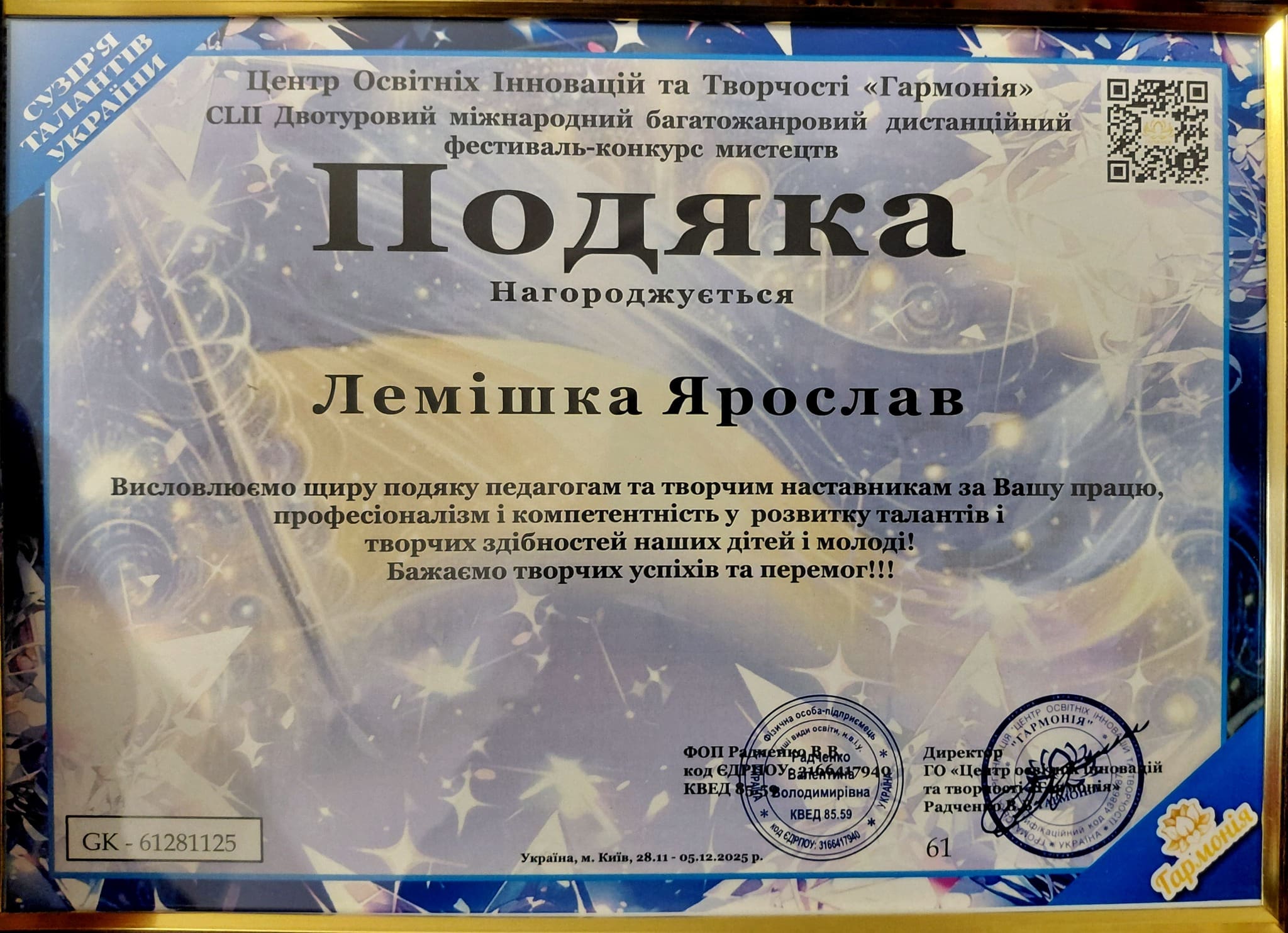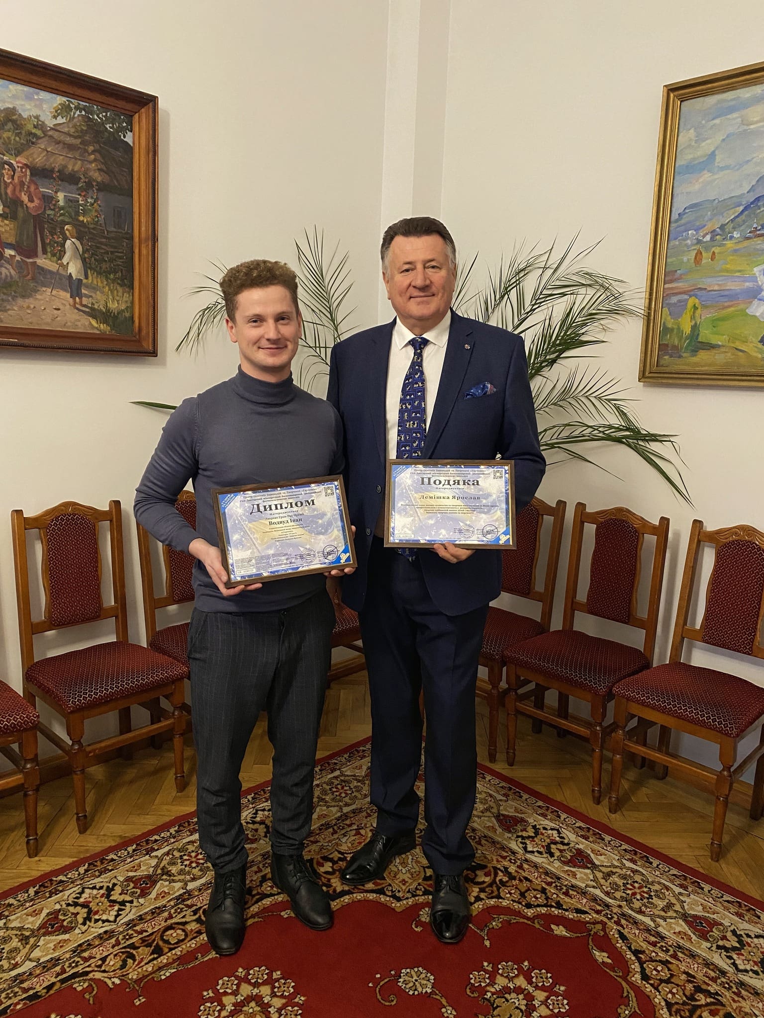 Високу нагороду артист отримав під творчим керівництвом і наставництвом заслуженого діяча мистецтв України, диригента академічного камерного оркестру Ярослава Лемішки.