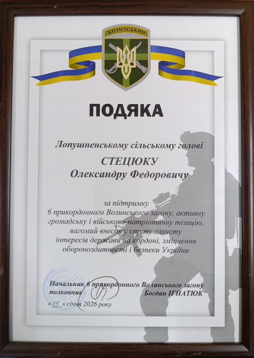 Очільник громади отримав подяку від 6-го прикордонного Волинського загону. Цей підрозділ виконує надскладні завдання на передових рубежах, і стабільна допомога з тилу є критично важливою для бійців.