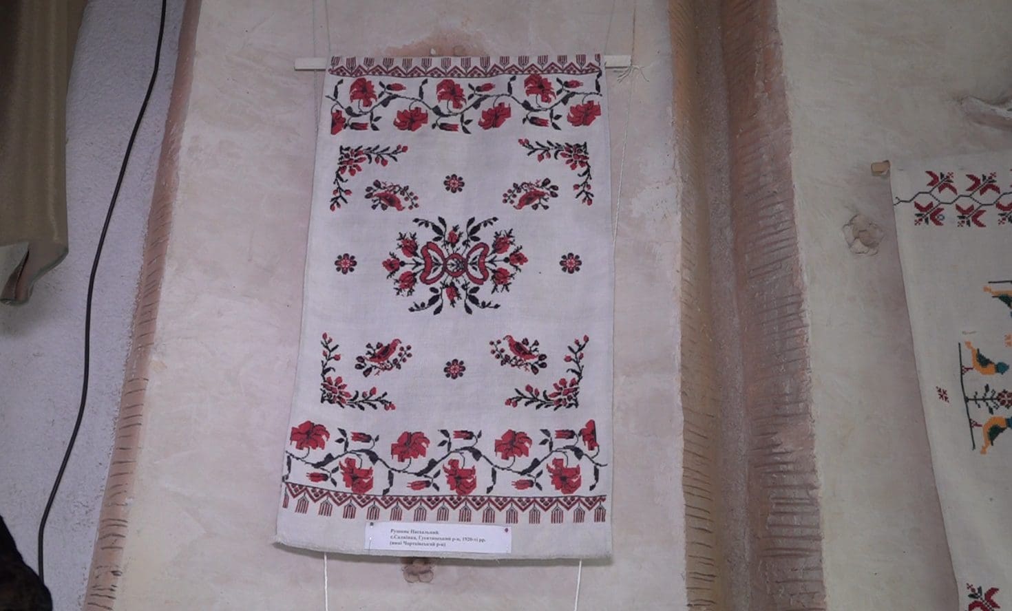 Село Саджівка (Чортківський район): Один із найдавніших експонатів початку XX століття. Вишитий у червоно-чорних тонах, де червоний символізував життя, а чорний — потойбіччя.
