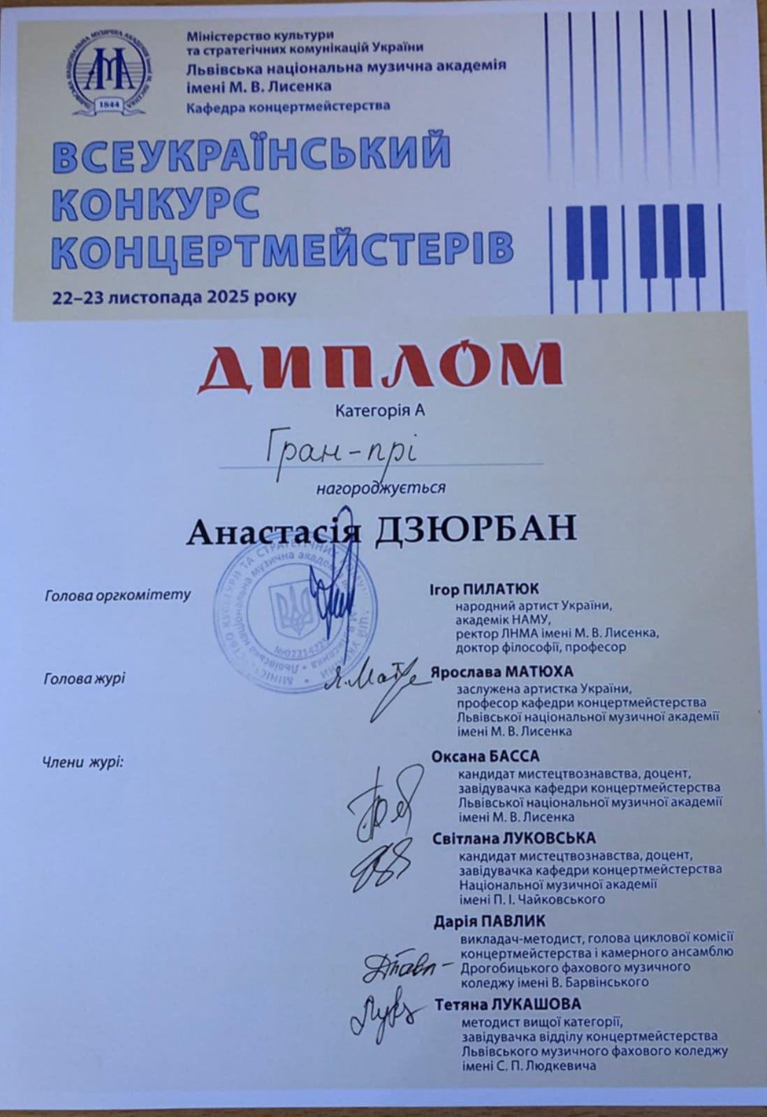 Студентка Тернопільського мистецького фахового коледжу імені Соломії Крушельницької Анастасія Дзюрбан стала володаркою Гран-прі на Всеукраїнському конкурсі концертмейстерів. Конкурс організувала кафедра концертмейстерства Львівської національної музичної академії імені Миколи Лисенка.