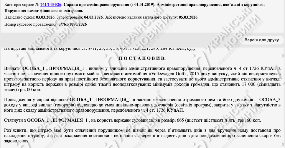 Суд встановив, що у декларації за 2023 рік Бугров не зазначив автомобіль Volkswagen Golf, яким користувався на праві безоплатного постійного користування, адже за документами автомобіль належить його сину.