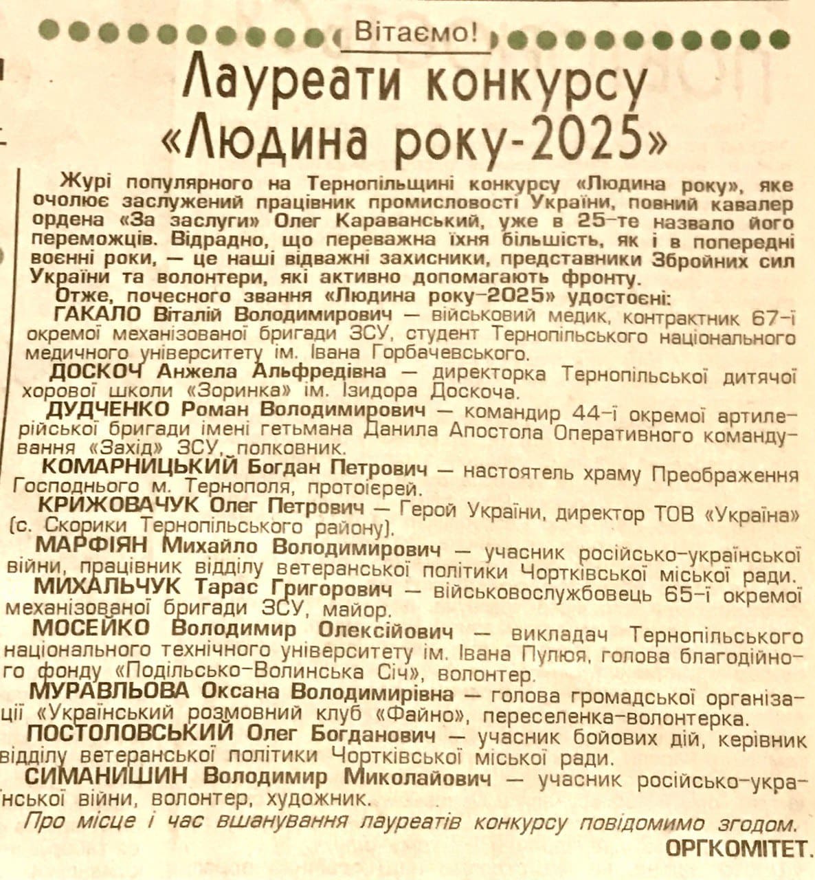 Клірика Тернопільської єпархії Православної Церкви України, настоятеля храму Преображення Господнього у Тернополі протоієрея Богдана Комарницького удостоїли звання лауреата конкурсу “Людина року 2025”.