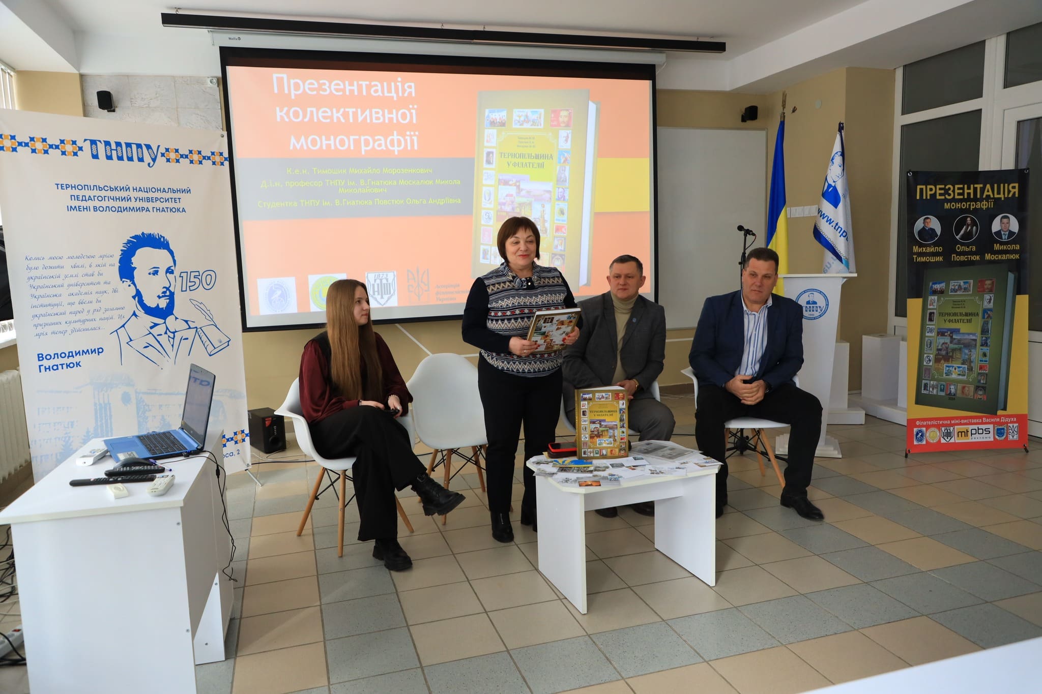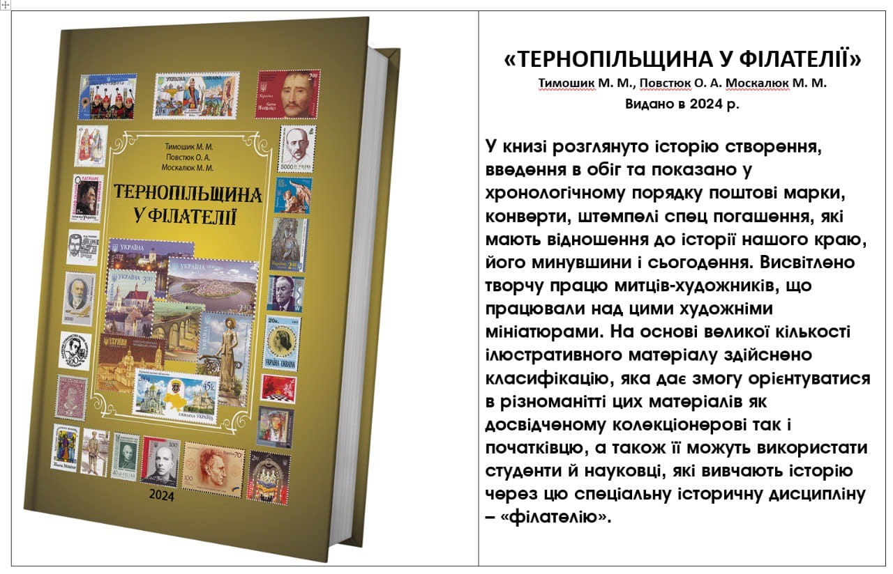 Торік було створено та надруковано колективну монографію «Тернопільщина у філателії». Авторський склад : кандидат економічних наук директор ТОВ «МТ ПБС» – Михайло Тимошик, студентка факультету мистецтв ТНПУ ім. В.Гнатюка – Ольга Повстюк, доктора історичних наук, професора професор ТНПУ ім. В.Гнатюка – Микола Москалюк.