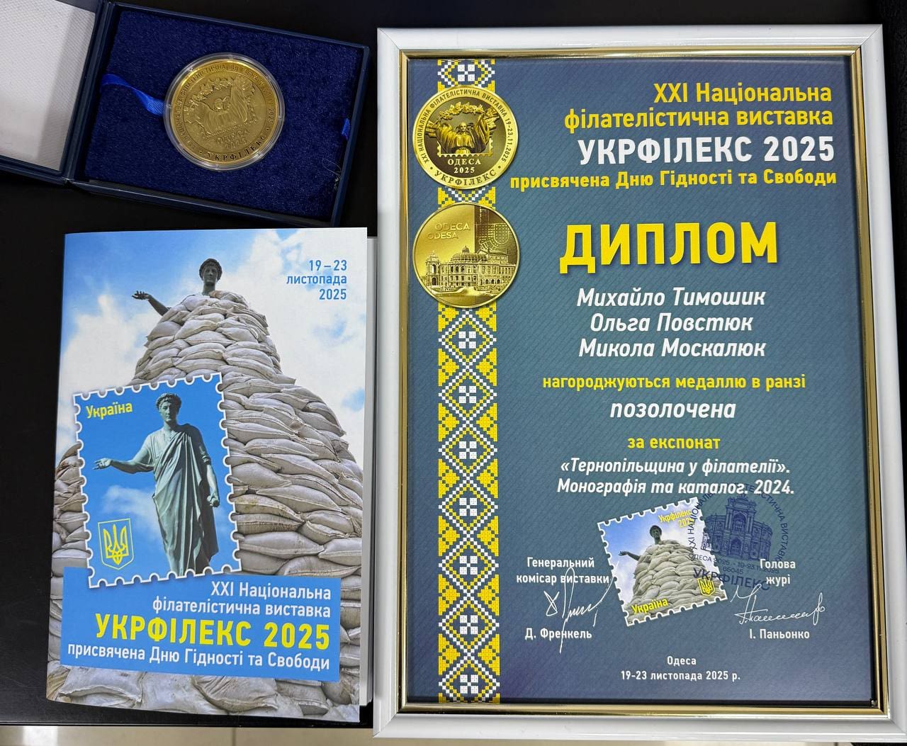 19 – 23 листопада у м. Одеса проходила ХХІ Національна філателістична виставка “Укрфілекс 2025”, присвячена Дню Гідності та Свободи. Тернопільське обласне товариство філателістів ім І. Чернявського АсФУ на виставці представляли сім експонентів із пятьма експонатами. Журі виставки високо оцінило роботи тернополян. Зокрема, позолоченою медаллю нагороджені Ольга Повстюк, Михайло Тимошик, Микола Москалюк за експонат «Тернопільщина у філателії», що був виставлений у літературному класі.
