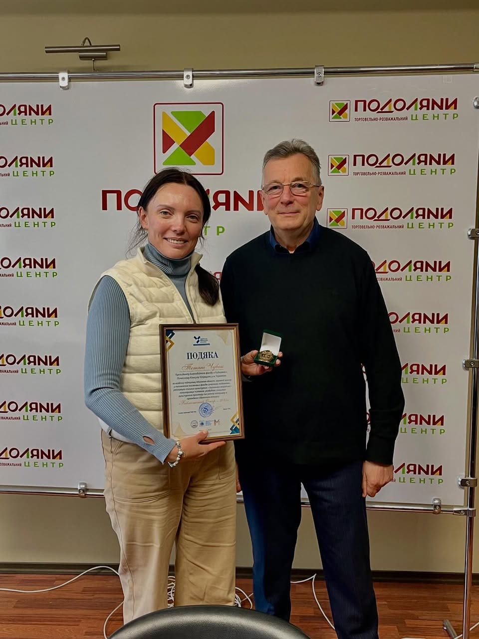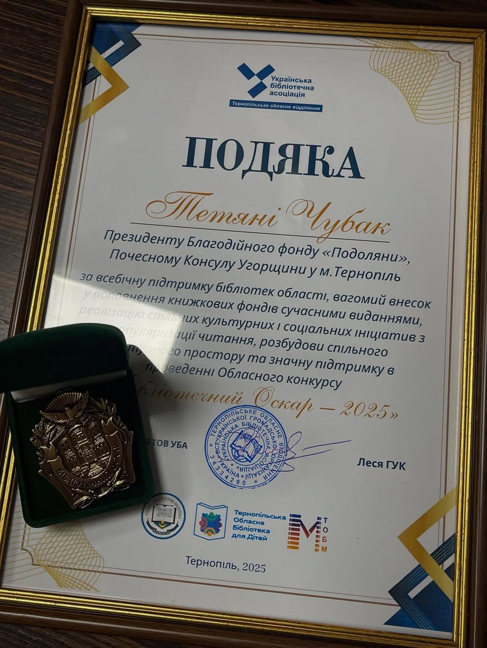 Директор Тернопільської обласної універсальної наукової бібліотеки Валерій Бачинський вручив президентці Благодійного фонду «Подоляни» Тетяні Чубак подяку за значний внесок у поповнення бібліотечних фондів сучасними виданнями, участь у соціально-культурних проєктах та підтримку конкурсу «Бібліотечний Оскар 2025».