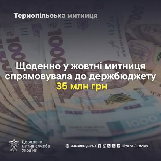 “Щоденно впродовж цього місяця Тернопільська митниця спрямовувала у державну скарбницю 35 млн гривень”.