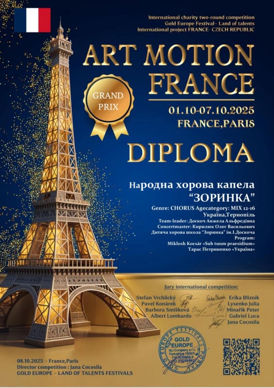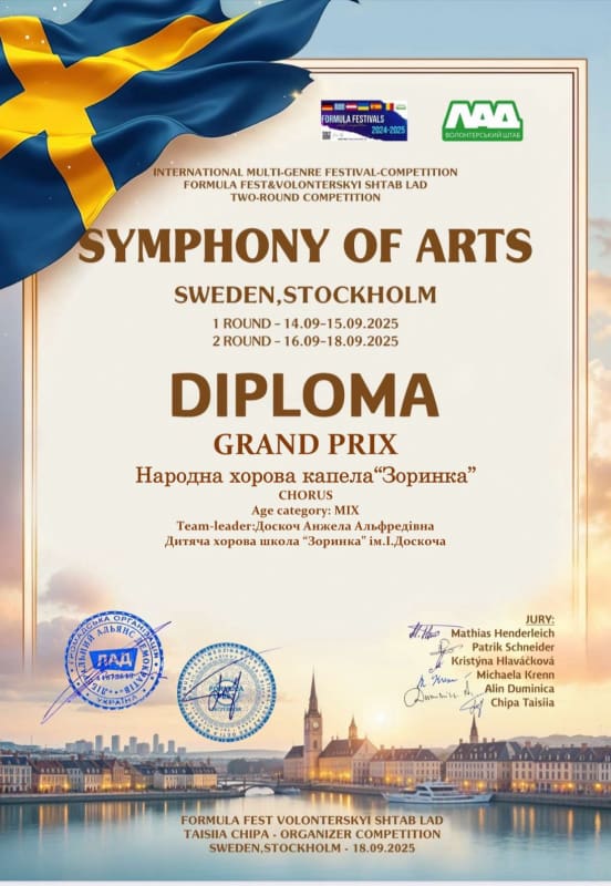 Народна хорова капела «Зоринка» здобула чотири престижні нагороди на міжнародних конкурсах у Швеції, Німеччині, Франції та Південній Кореї, прославляючи українське мистецтво.