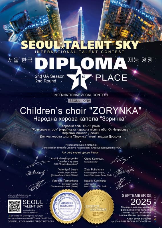 - 1 місце на «SEOUL TALENT SKY» у Сеулі (Сеул-Київ) у номінації «Хоровий спів» (12-16 років).