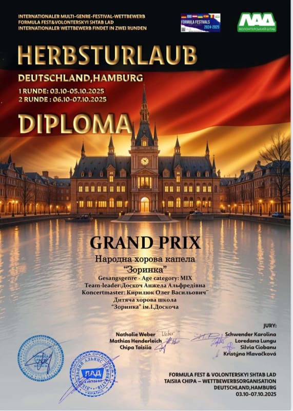 - гран-прі на «HERBSTURLAUB» у Гамбурзі (Німеччина), концертмейстер — Олег Кирилюк;