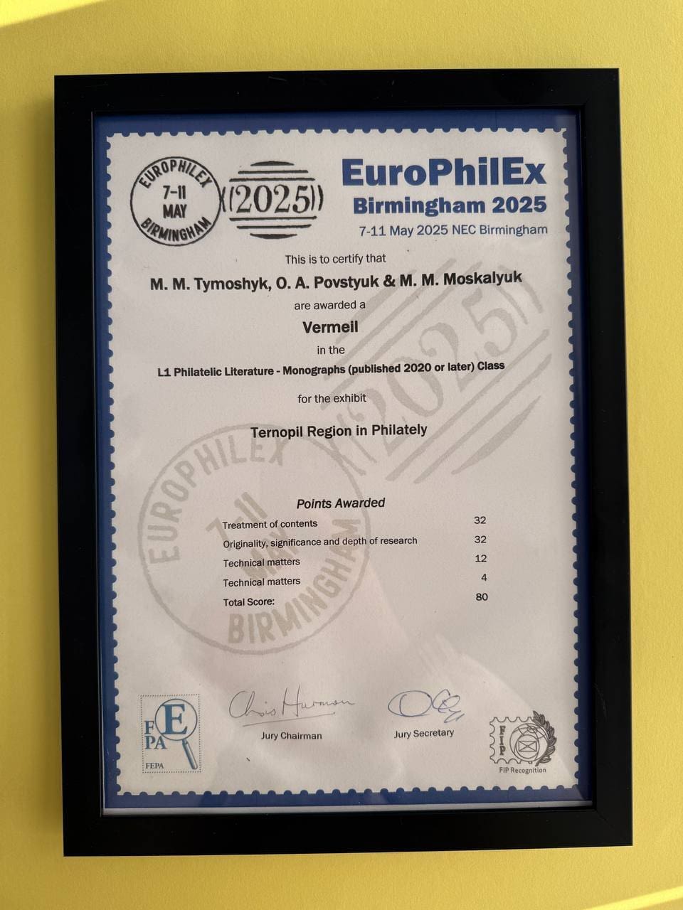 Автори монографії “Тернопільщина у філателії” Михайло Тимошик, Ольга Повстюк і Микола Москалюк були удостоєні позолоченої медалі. Журі оцінило роботу тернопільських філателістів у 80 балів.