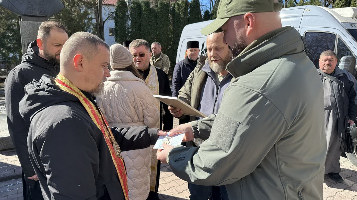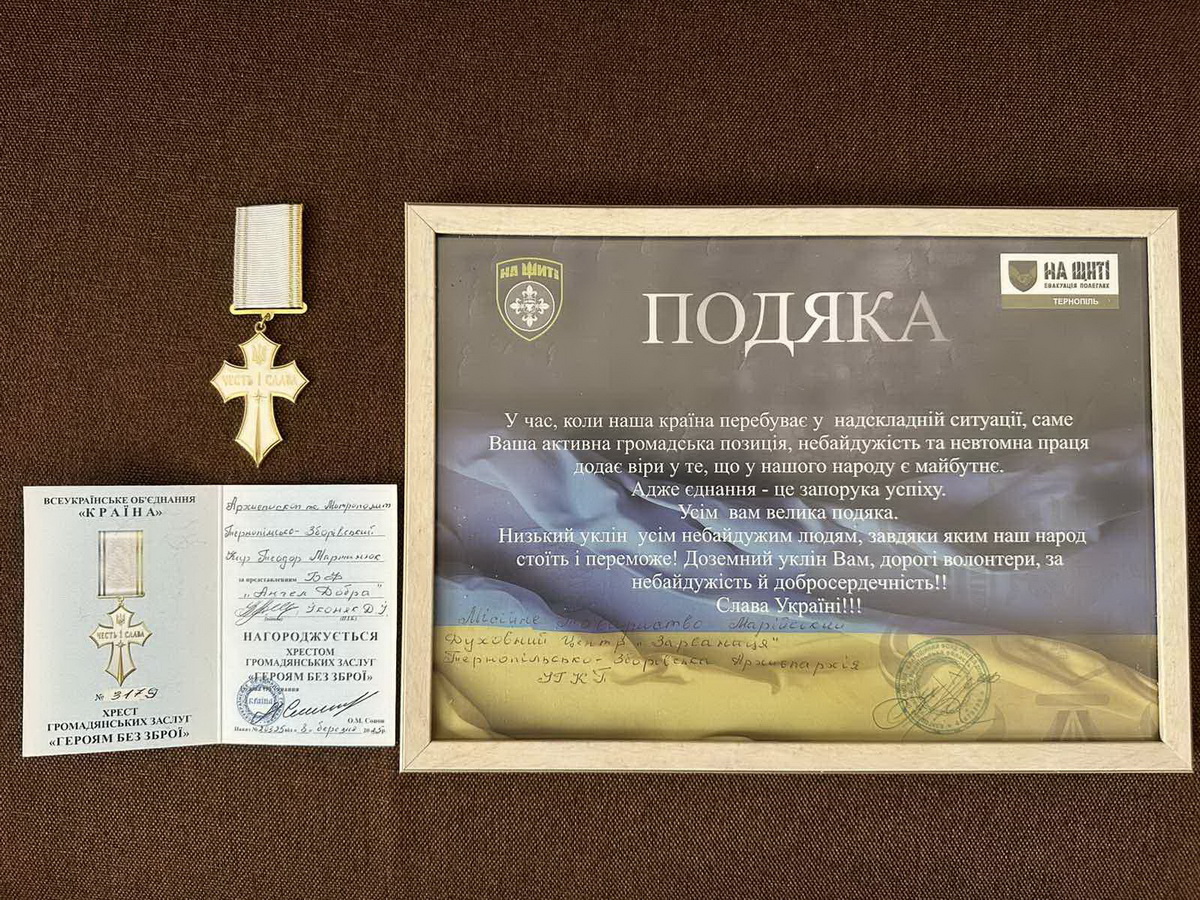 На знак вдячності за передані автомобілі для ЗСУ представники фонду «Ангел добра» вручили митрополиту Теодору Мартинюку хрест громадянських заслуг «Героям без зброї».