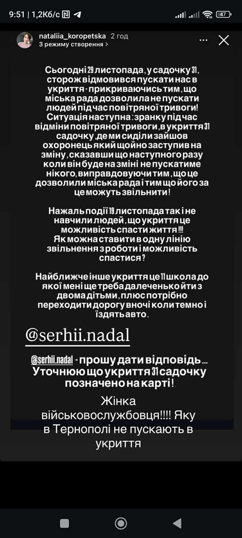 «Після 19 листопада ми всі зрозуміли ціну кожної хвилини. Укриття — це шанс врятувати життя собі й дітям. Чому охоронець посилається на якісь «дозволи» міськради?» — написала тернополянка у соцмережах.