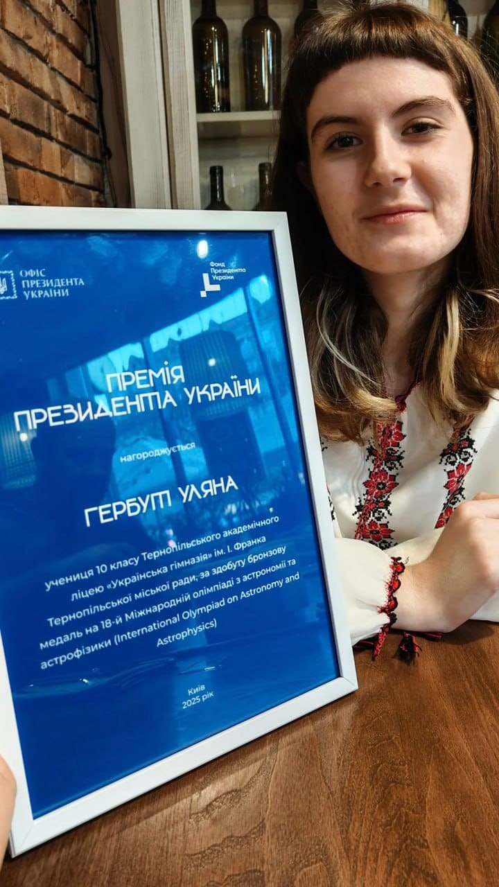 Випускниця Тернопільського академічного ліцею «Українська гімназія» імені Івана Франка Уляна Гербут отримала сертифікат на здобуття премії Президента України. З цією нагородою тернополянку особисто привітав Президент Володимир Зеленський під час урочистої зустрічі з педагогами та активною молоддю у Києві.