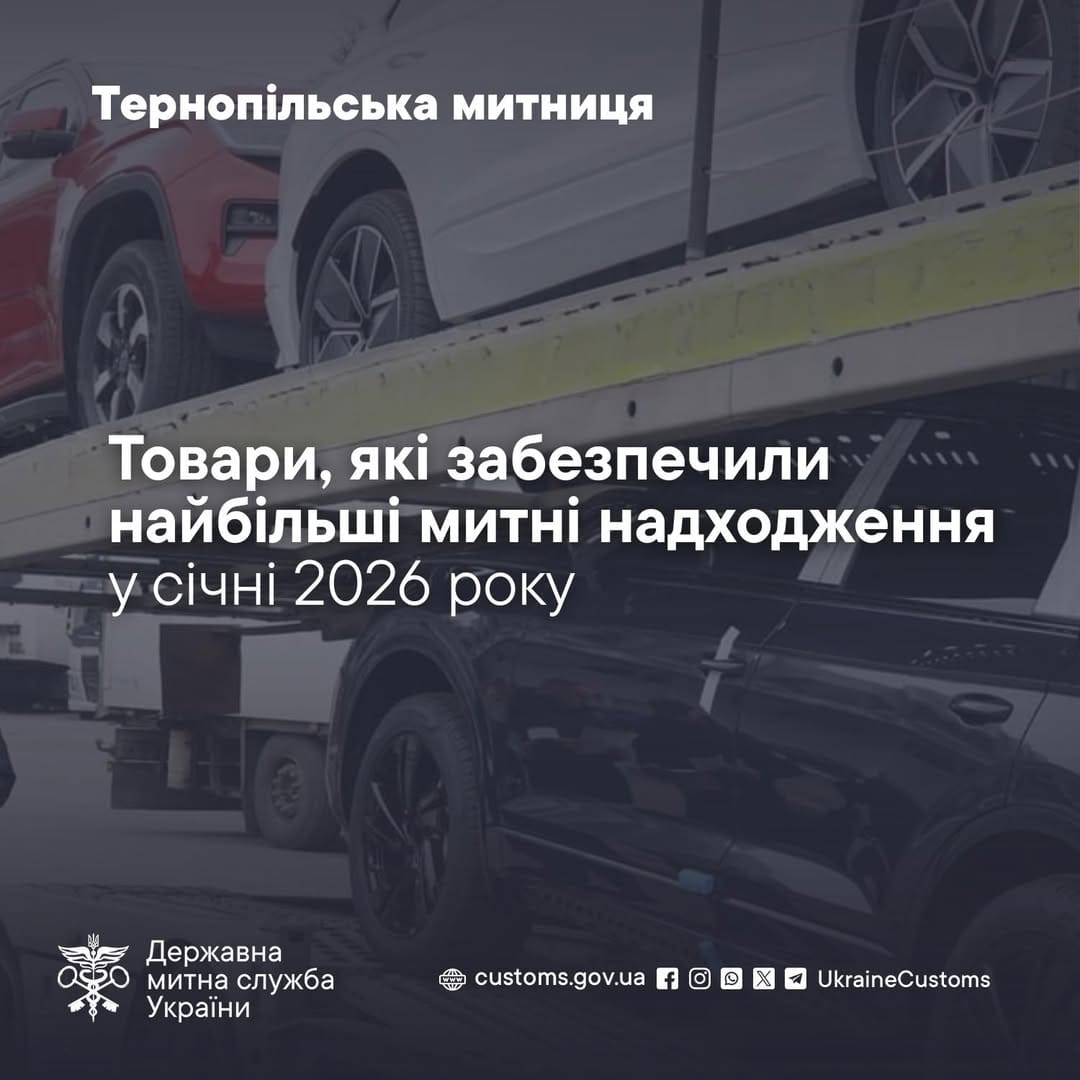 За результатами аналізу митних оформлень найбільші надходження до держскарбниці у січні 2026 року забезпечили легкові автомобілі – майже 40 млн гривень. Оформлення цієї категорії товарів традиційно формує вагому частку митних платежів у зоні діяльності Тернопільської митниці.