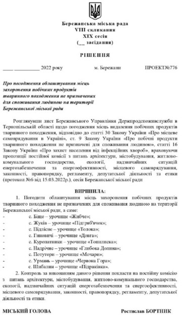 На сайті Бережанської міської ради зареєстрований проєкт рішення, згідно якого визначаються місця захоронення побічних продуктів тваринного походження не призначених для споживання людиною.