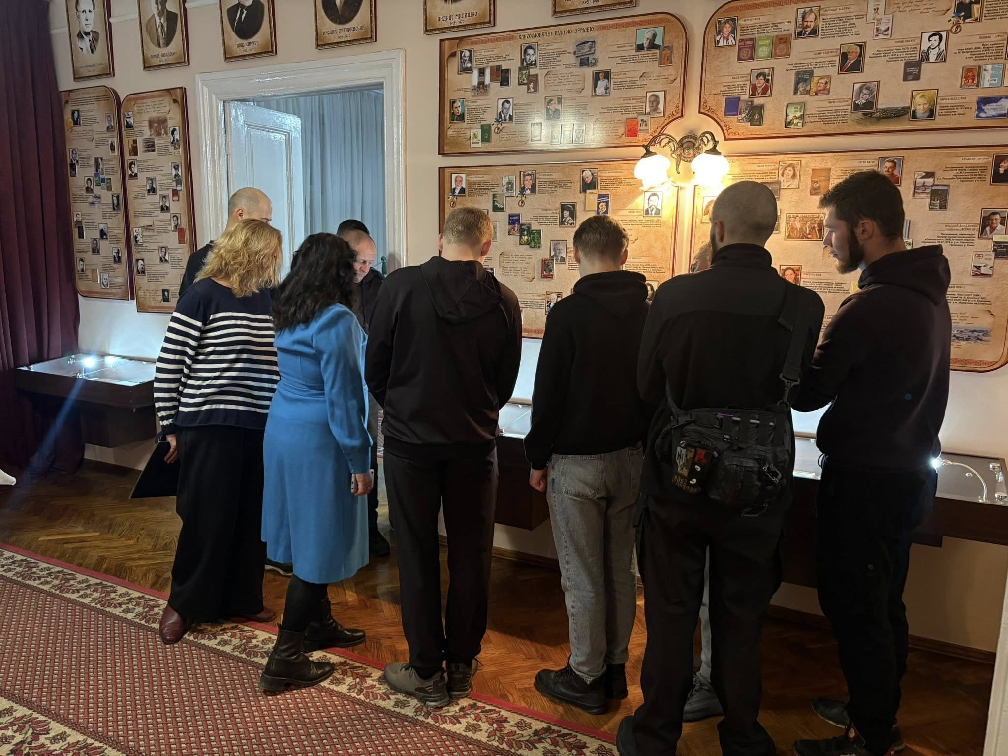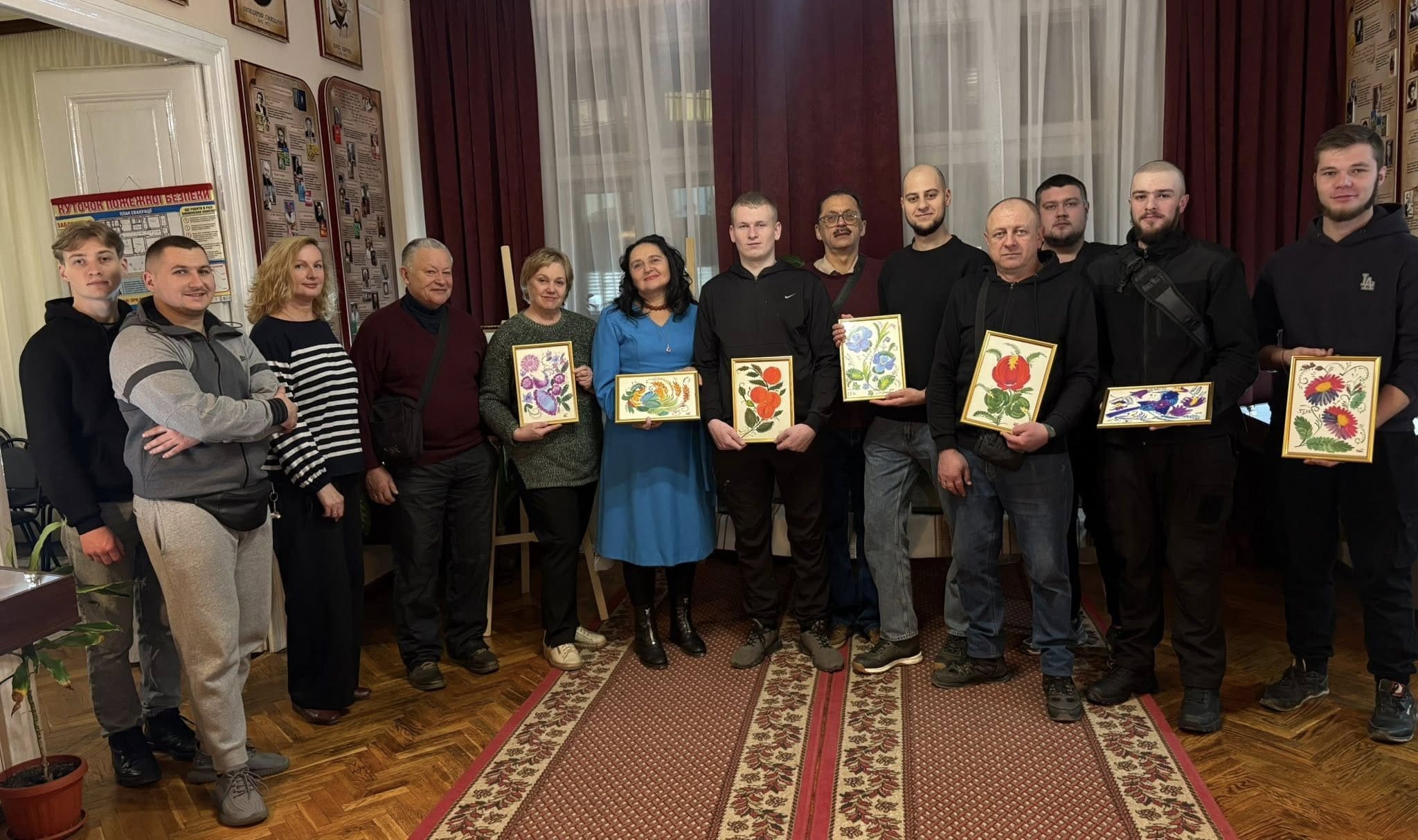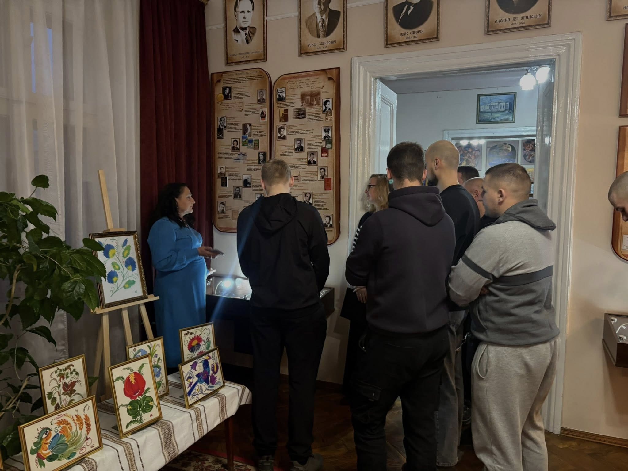 На відкриття виставки завітали студенти третього курсу Тернопільського національного технічного університету імені Івана Пулюя спеціальності ДЖ-11 «Галузеве машинобудування». Разом зі старшим викладачем Володимиром Стручком вони ознайомилися з особливостями петриківського розпису та творчістю мисткині.