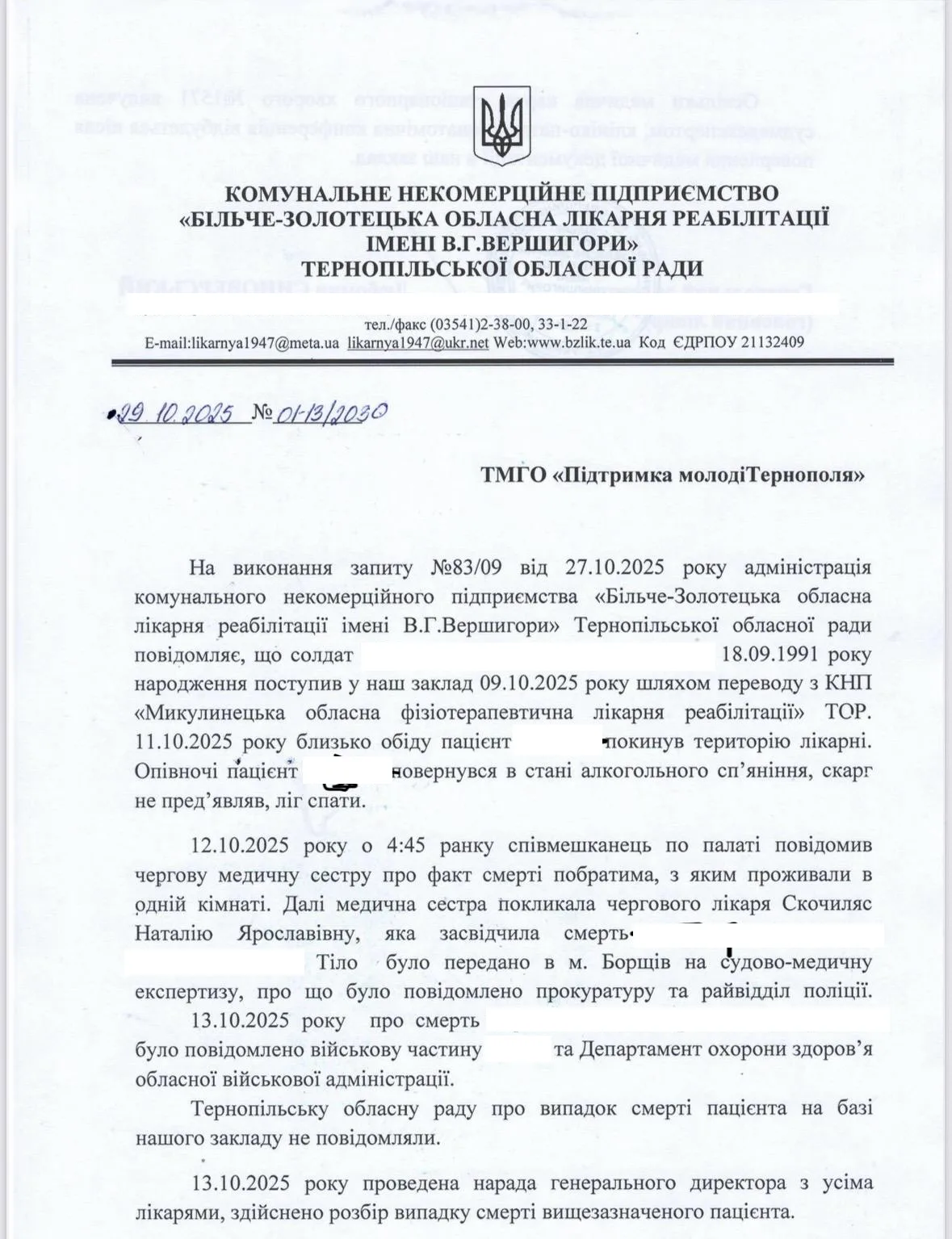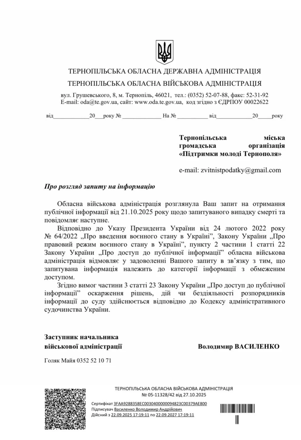 Громадська організація «Підтримка молоді Тернополя» направила офіційний запит до Тернопільської обласної військової адміністрації з проханням надати інформацію про обставини смерті військовослужбовця. У відповідь, листом №05-11328/42 від 27 жовтня 2025 року, заступник начальника ОВА Володимир Василенко повідомив, що відомості «належать до категорії інформації з обмеженим доступом». У документі посадовці послалися на Указ Президента про воєнний стан і норми Закону «Про доступ до публічної інформації».