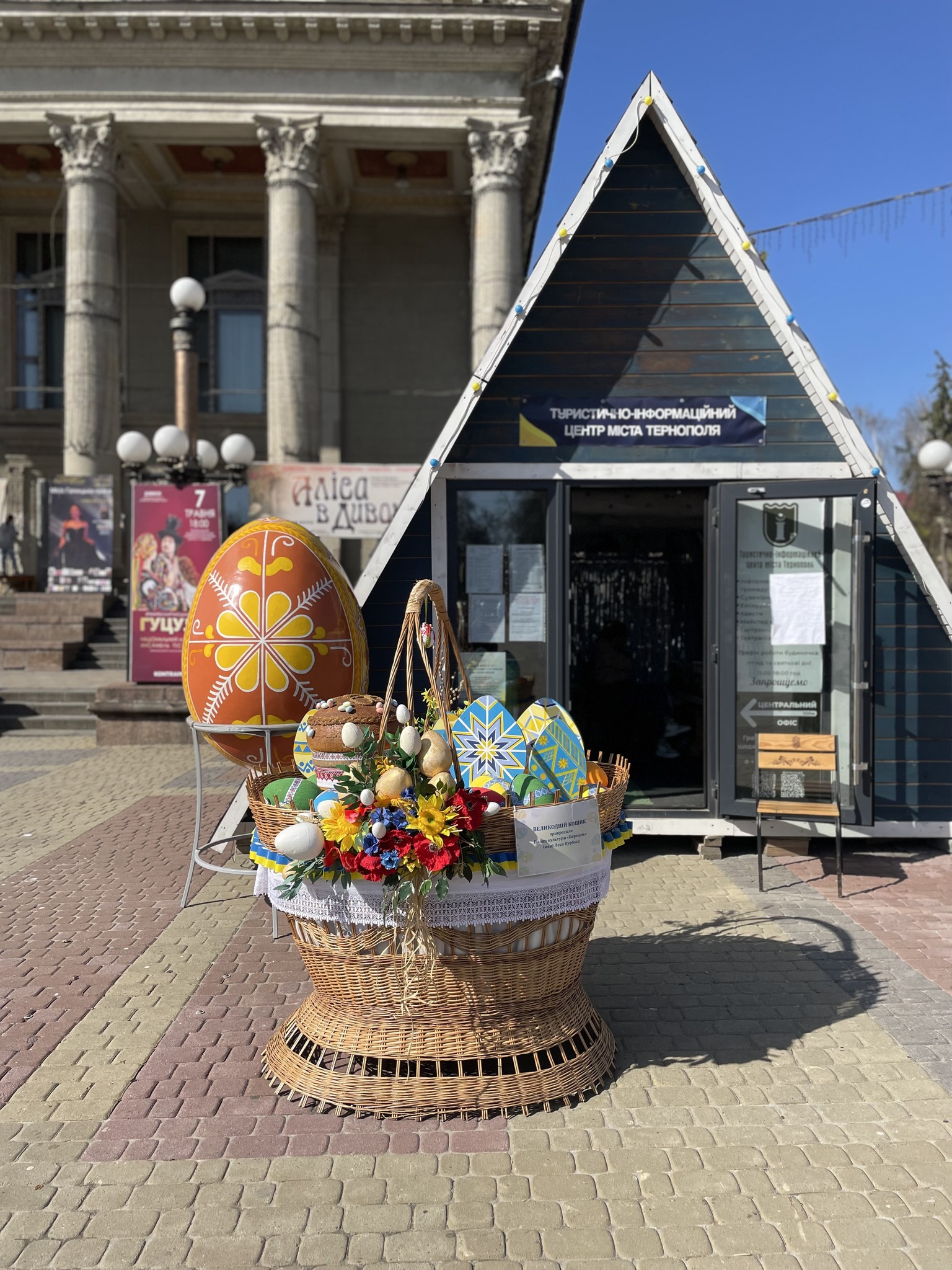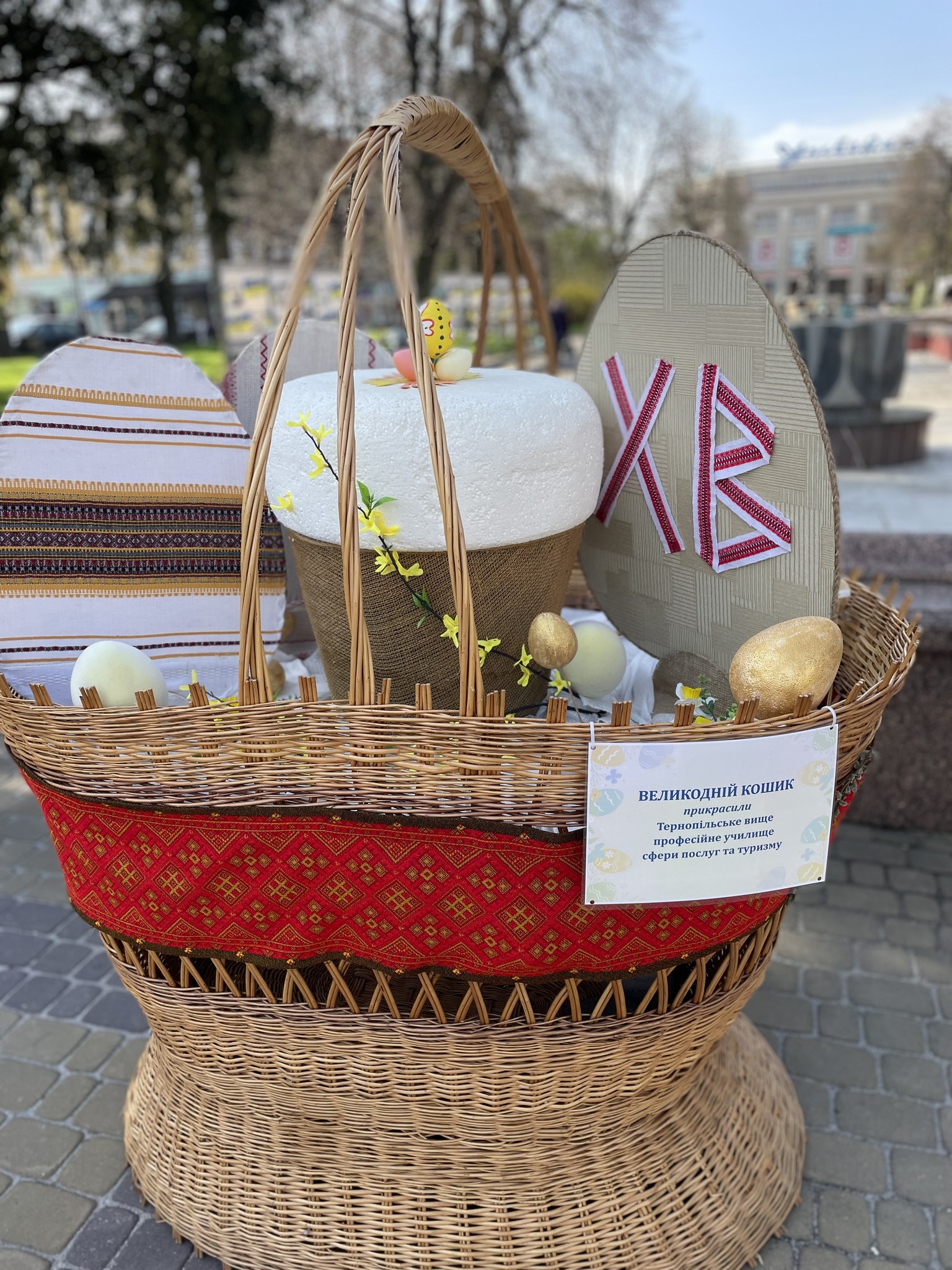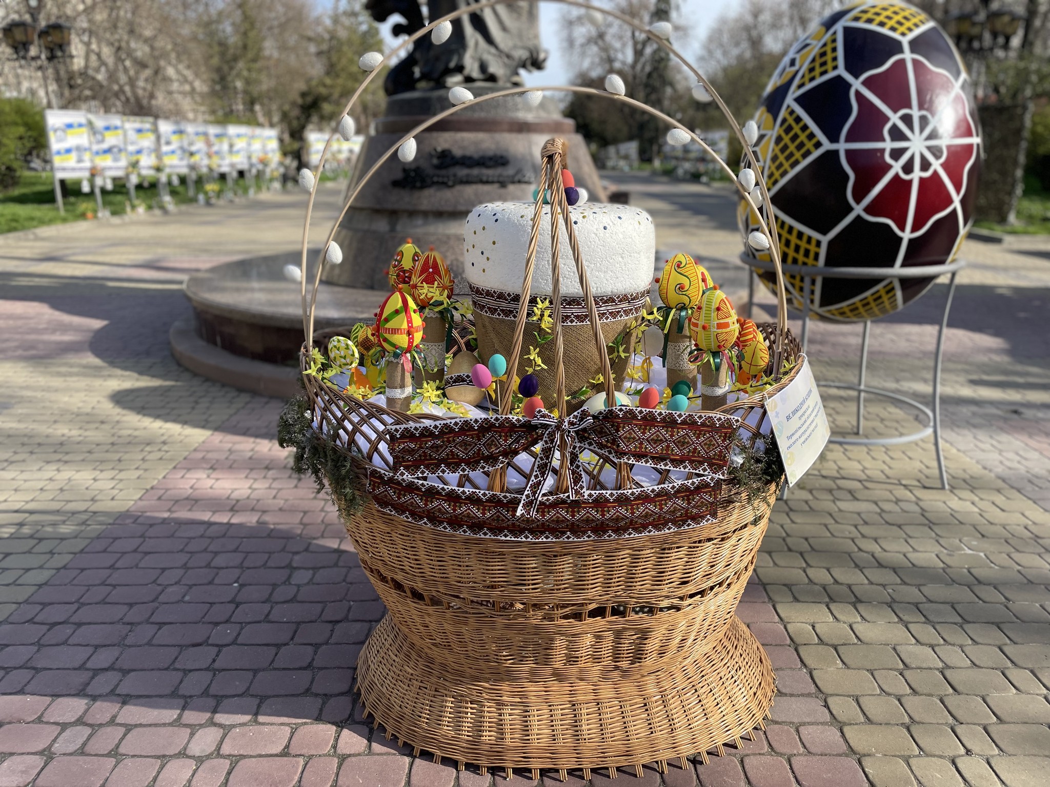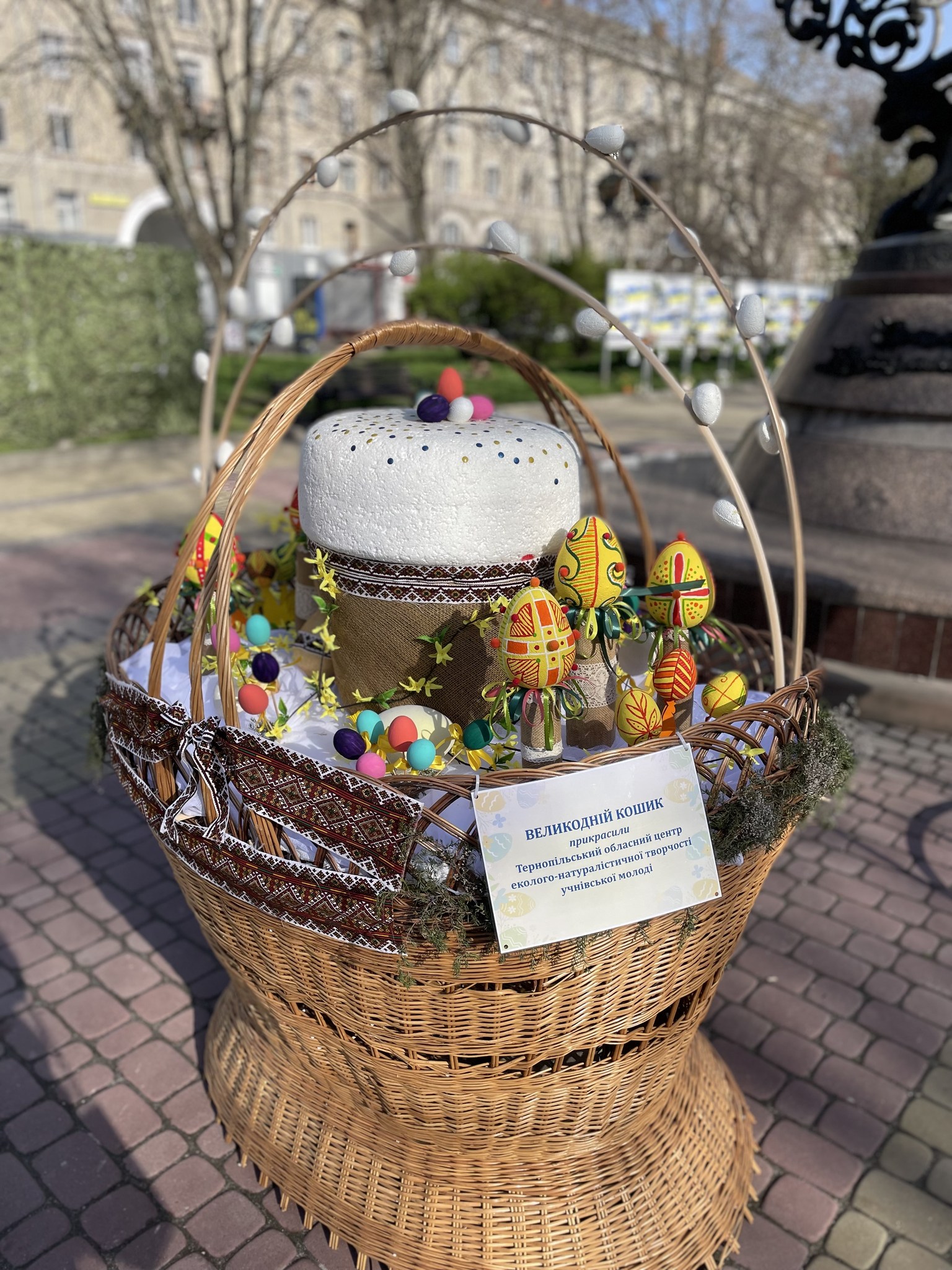 «У самому серці міста з’явилася відкрита „Великодня експозиція просто неба“ – яскраві фотозони з великими кошиками, писанками та іншими символами свята», — повідомили в Тернопільській міській раді.