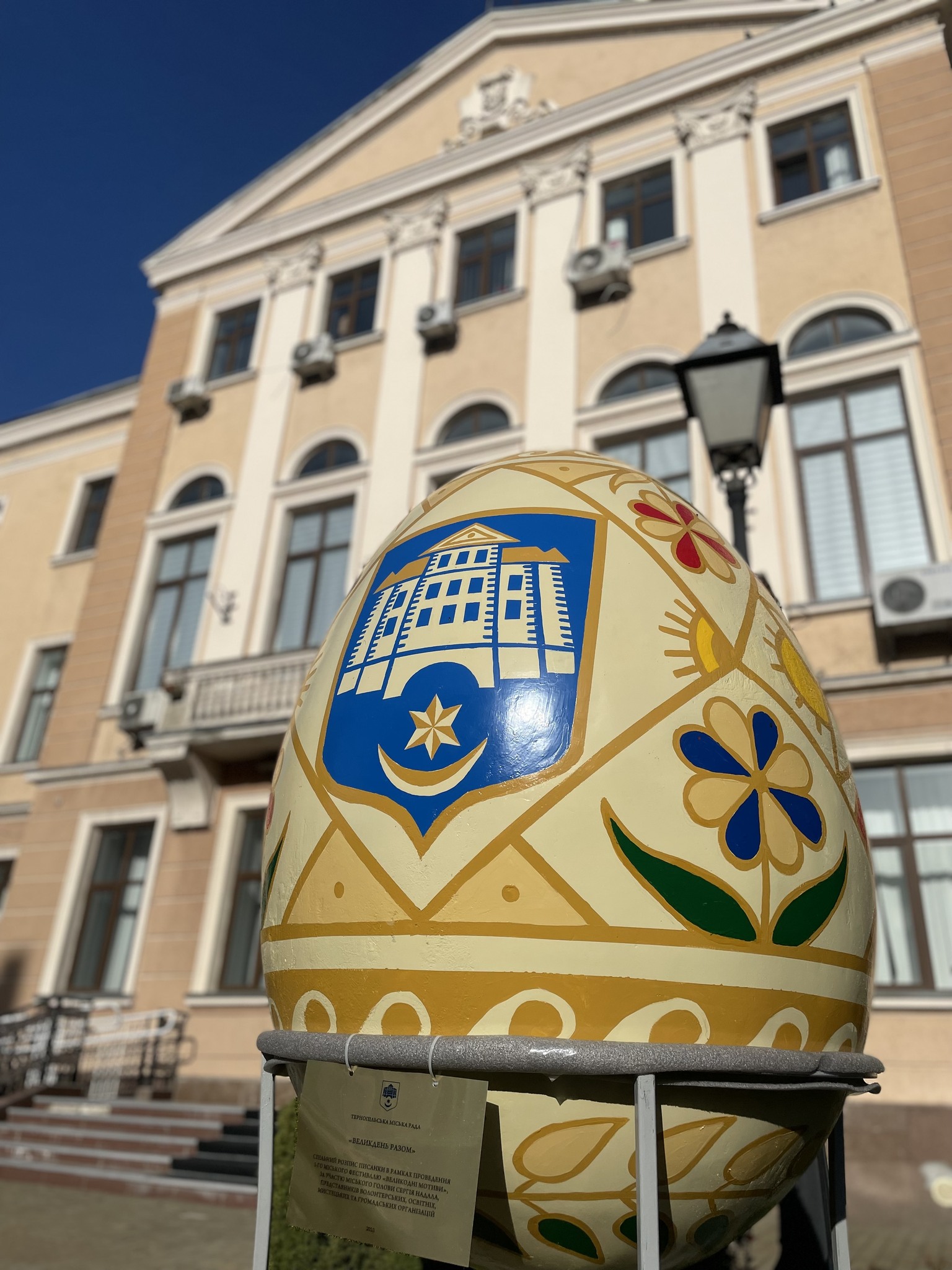 Окрему увагу привертає одна з писанок — її розписували спільно жителі Тернопільської громади. На цій писанці зображено Герб Тернополя, і вона встановлена неподалік будівлі міської ради.