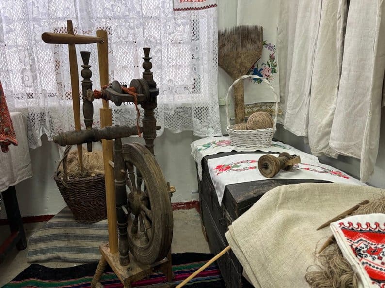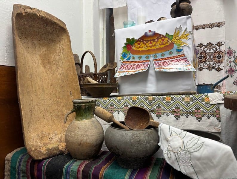 Серед експонатів — швейна машинка «Зінгер», лавки, скрині, рядна, вишиті рушники, кухонне начиння та інші предмети давнього побуту.