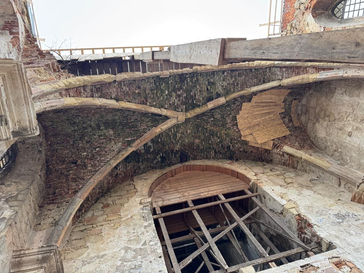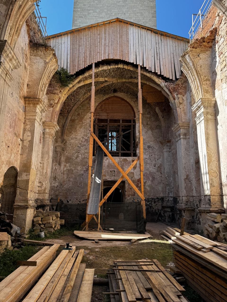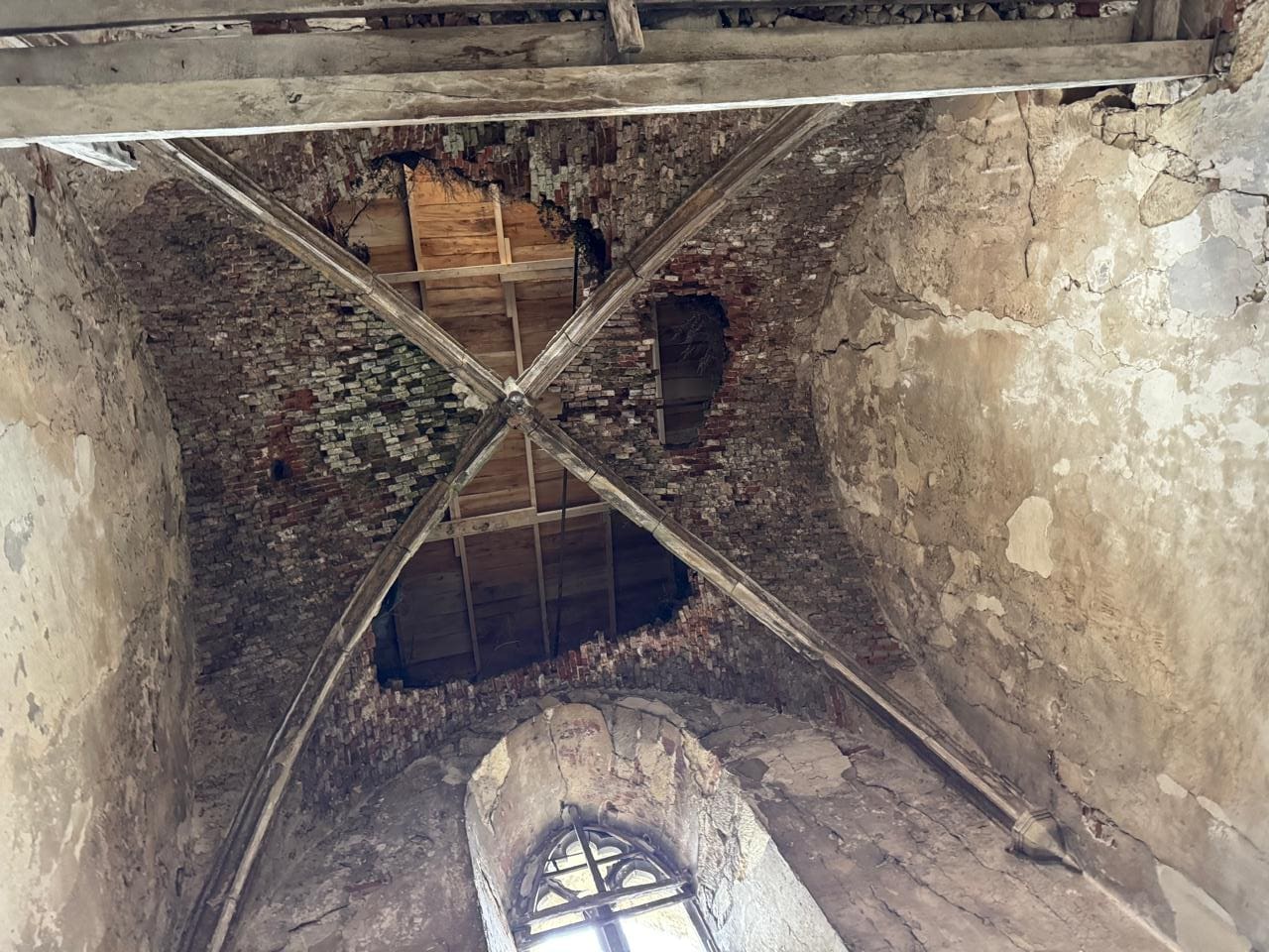 - Відсутність покрівлі над навою, пресвітерієм та вежею, що призводить до руйнування стін опадами.