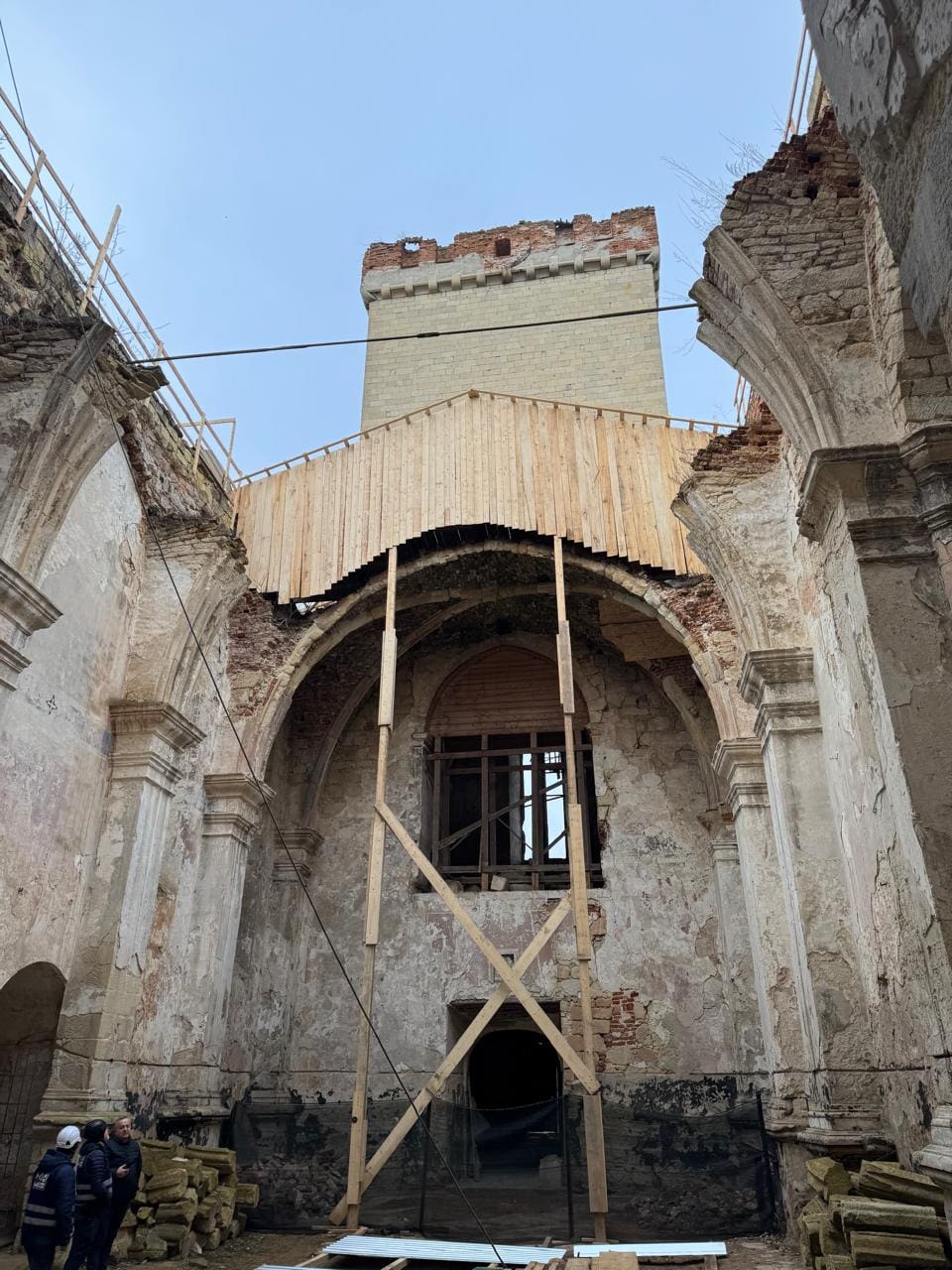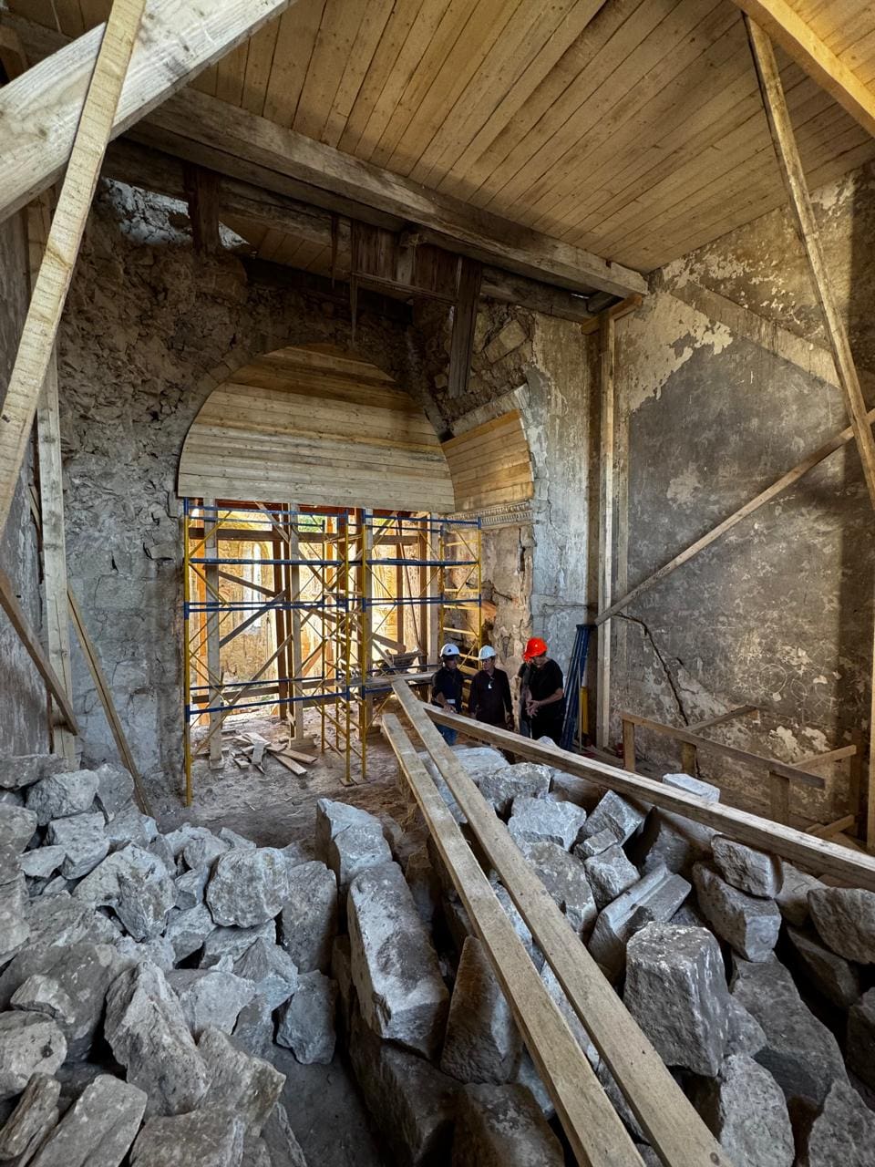 - Ремонт вежі: видалення нестабільних фрагментів північної стіни вежі, відновлення кам’яного облицювання та захист карнизів від потрапляння вологи.