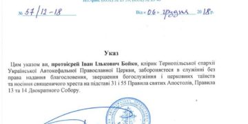 Як повідмоляє прес-служба Тернопілької єпархії Української Автокефальної Православної Церкви, на підставі Правил святих Апостолів, архієпископом Тернопільським і Бучацьким Тихоном, було заборонено в служінні священика Івана Ільковича Бойка, без права наданання благословення, звершення богослужіння і церковних таїнств та носіння священичого хреста.