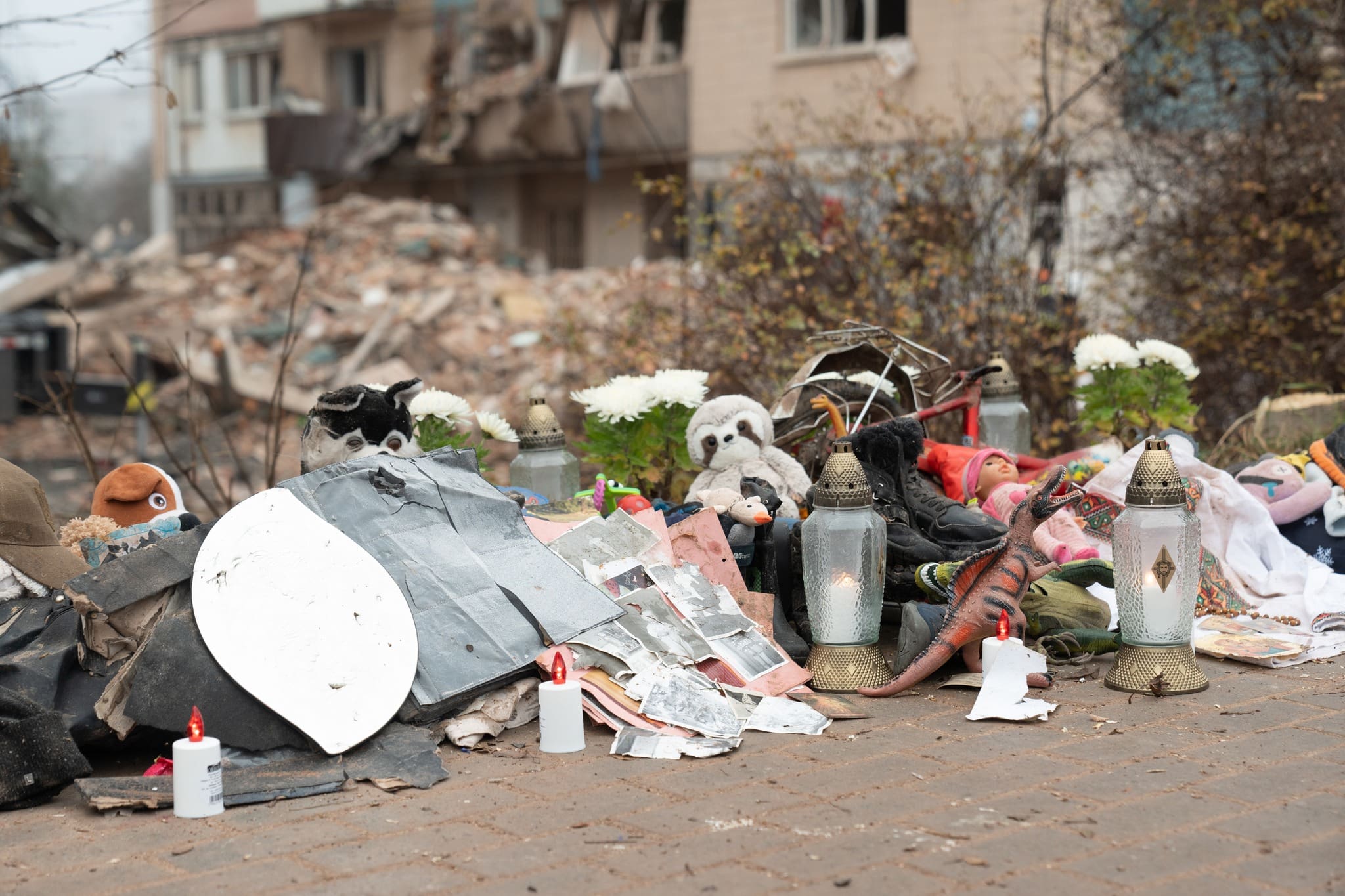 Тернополяни несуть квіти й іграшки до зруйнованого обстрілом РФ будинку