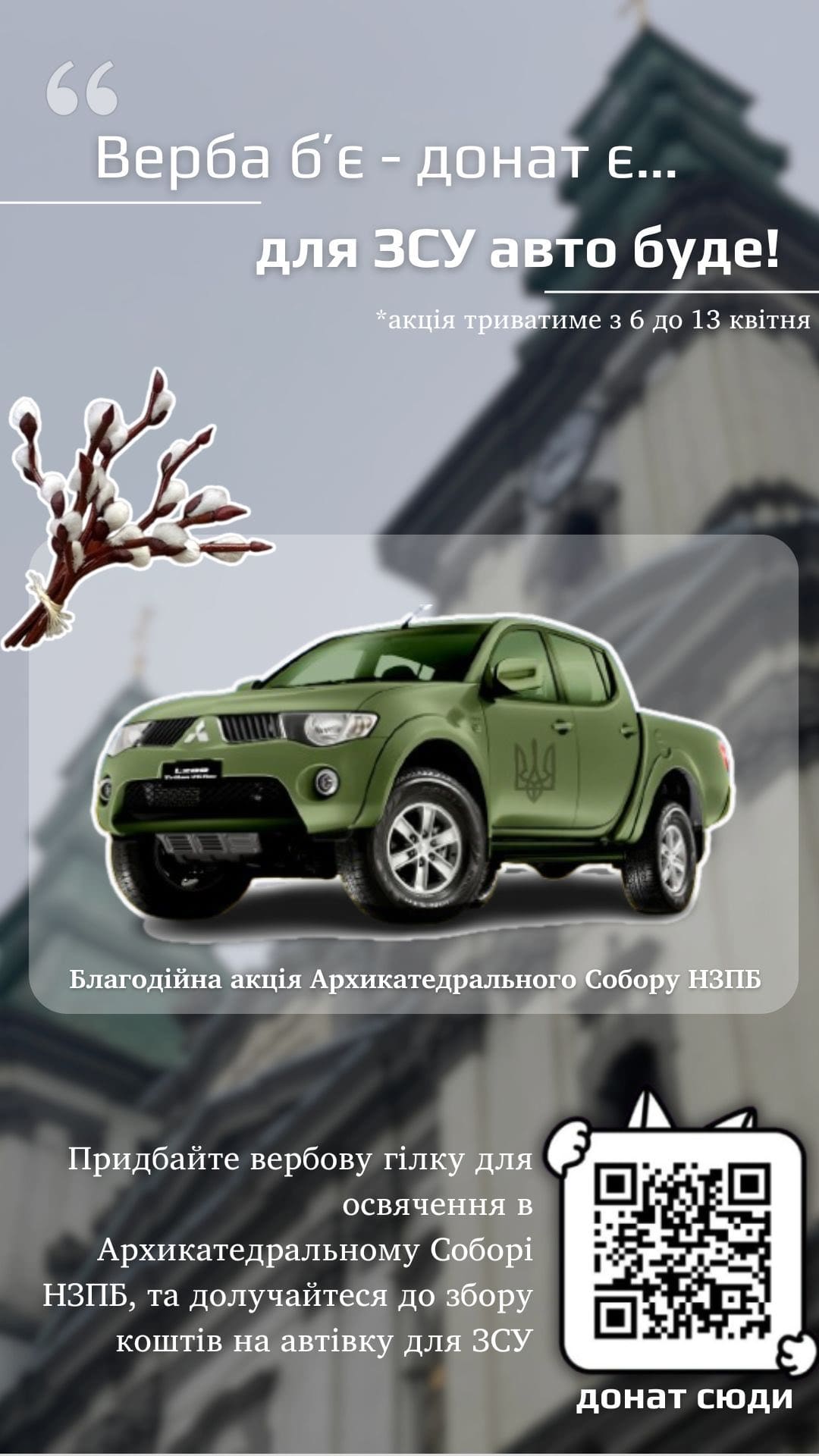 У Квітну неділю, 13 квітня, біля Архикатедрального Собору НЗПБ у Тернополі відбулася благодійна ініціатива «Верба бʼє – донат є, для ЗСУ авто буде». Волонтери, парафіяни та родичі військових підготували вербові галузки, які розповсюджували в обмін на пожертви. Зібрані кошти підуть на придбання автомобіля для бригади, в якій служить воїн Андрій Козаков з позивним «Дизель».