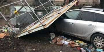 А в одному з дворів на авто таки вітром знесло накриття сміттєвих баків. Сильний вітер також зірвав банер з Тернопільського національного технічного університету імені І. Пулюя.