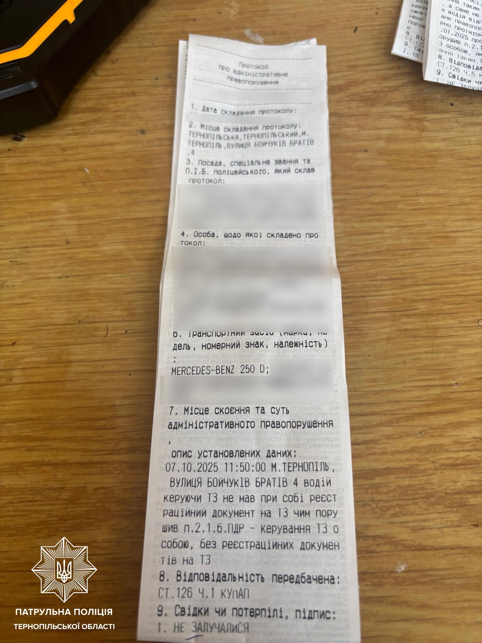 - за ч. 1 ст. 126 КУпАП – відсутність свідоцтва про реєстрацію транспортного засобу;