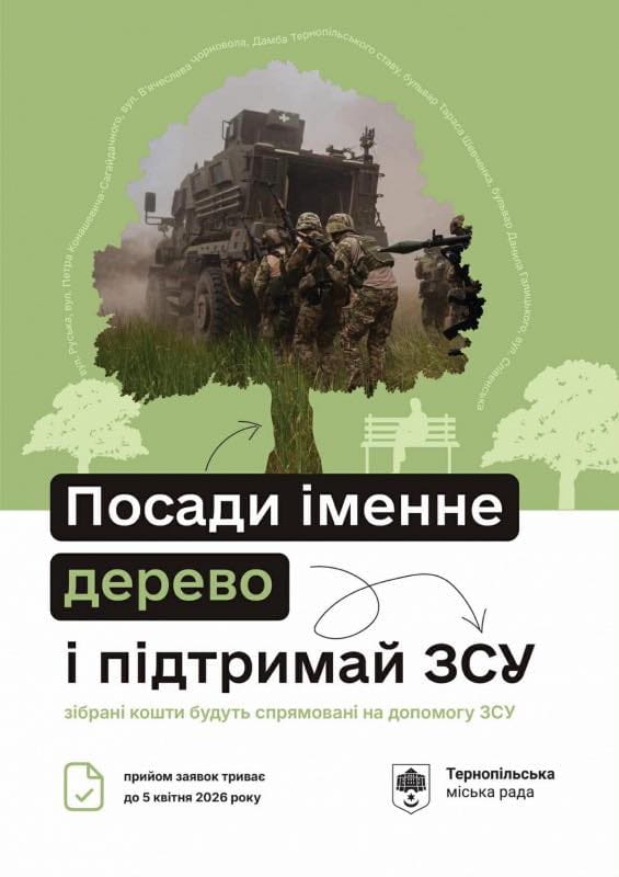 Уже завтра, 18 березня, в Тернополі розпочнеться прийом заявок на участь у черговому четвертому етапі акції «Підтримуй ЗСУ – посади іменне дерево». Ця ініціатива покликана не лише зробити місто зеленішим і затишнішим, а й об’єднати громаду заради важливої мети – підтримки Збройних сил України.