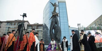 Розпочався захід на площі Героїв із молебня, пізніше родини загиблих поклали квіти до пам’ятника Небесній Сотні.
