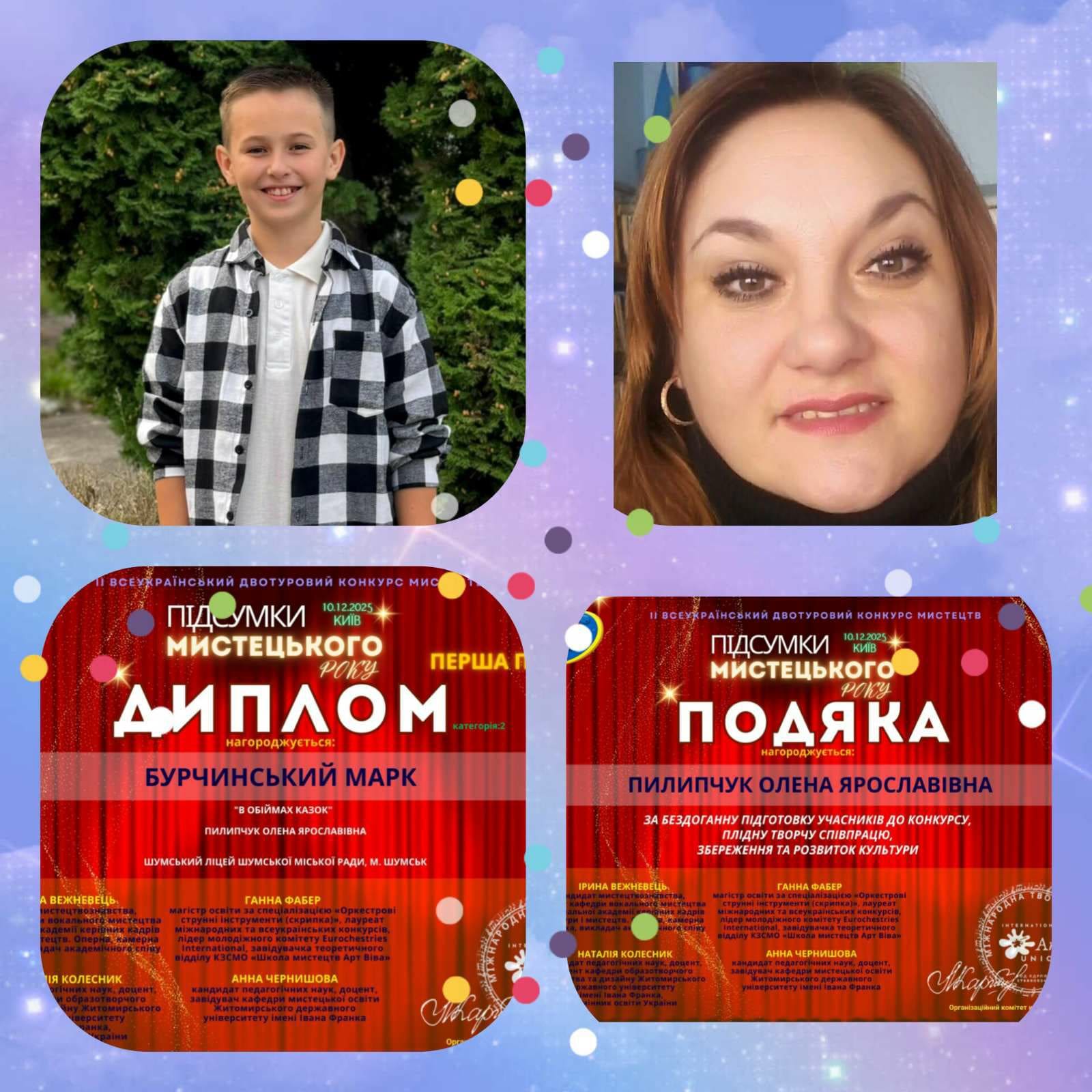 Учень 5-А класу Шумського ліцею Шумської міської ради Марко Бурчинський став переможцем ІІ Всеукраїнського двотурового конкурсу мистецтв Підсумки мистецького року. Юний ліцеїст виборов першу премію, продемонструвавши високий рівень майстерності та творчого мислення.