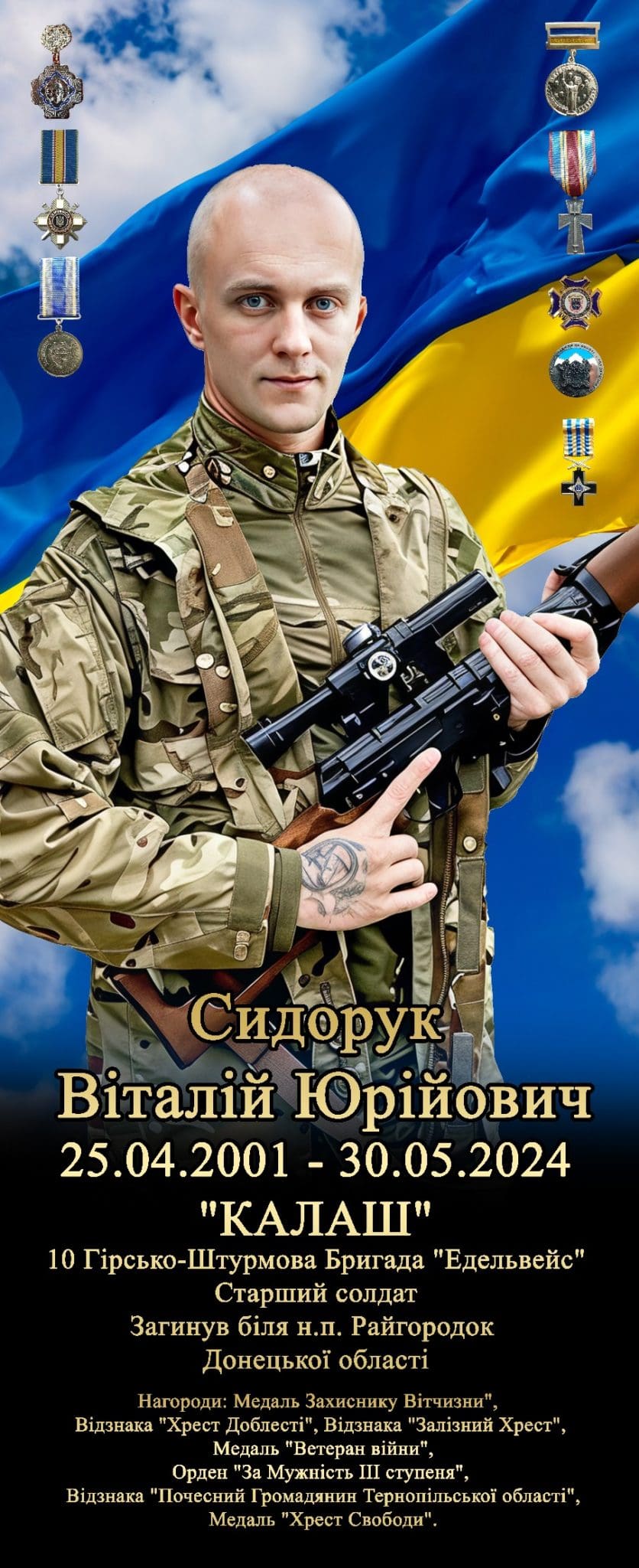 Раніше ми писали про те, що на Донеччині загинув 23-річний доброволець із Копичинецької громади Віталій Сидорук