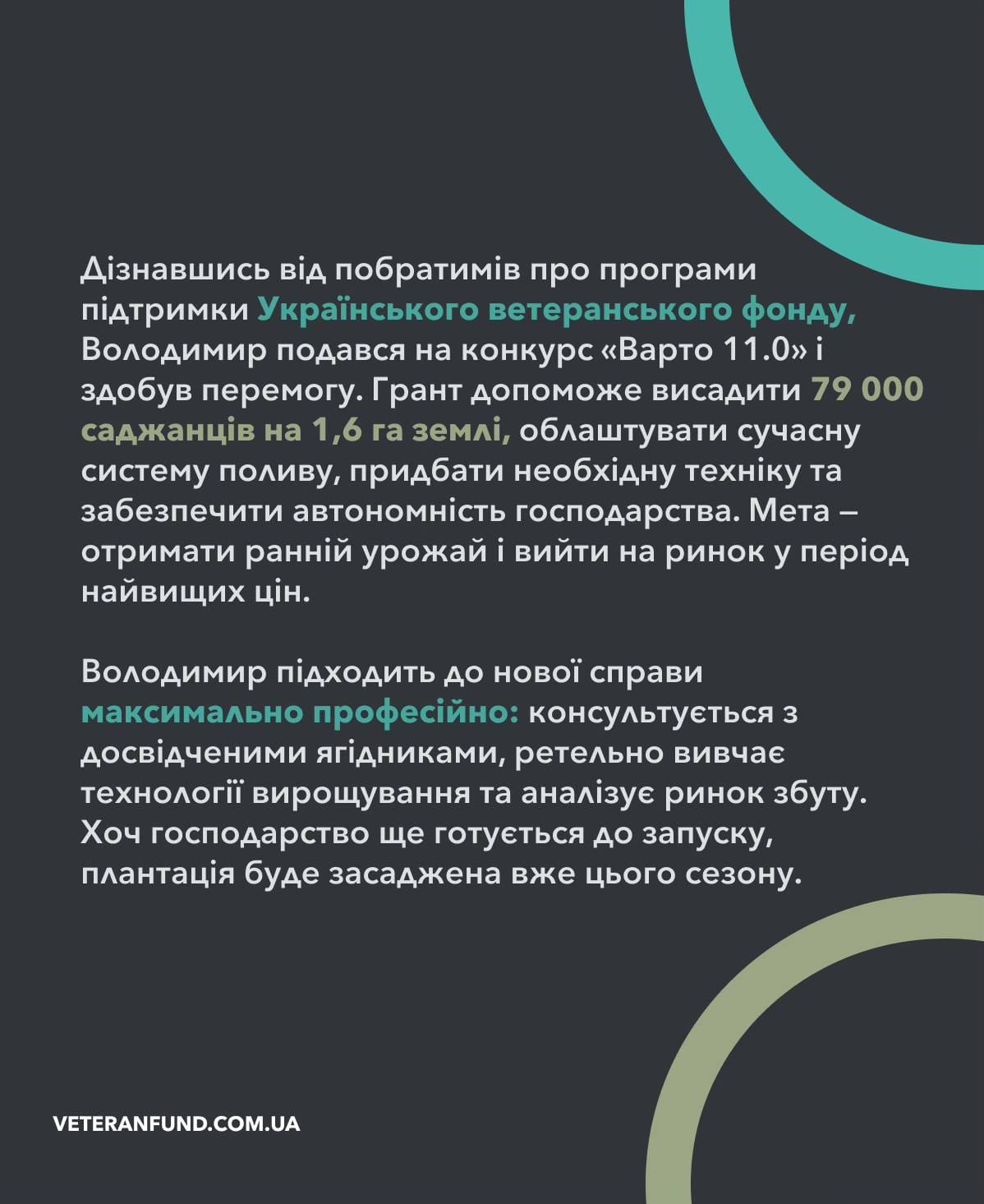 Поки триває підготовка землі, 41-річний ветеран вступив до агротехнічного коледжу на спеціальність «агрономія». «Бізнес вимагає не лише рук, а й знань. У моєму віці вчитися не пізно», — переконаний він.