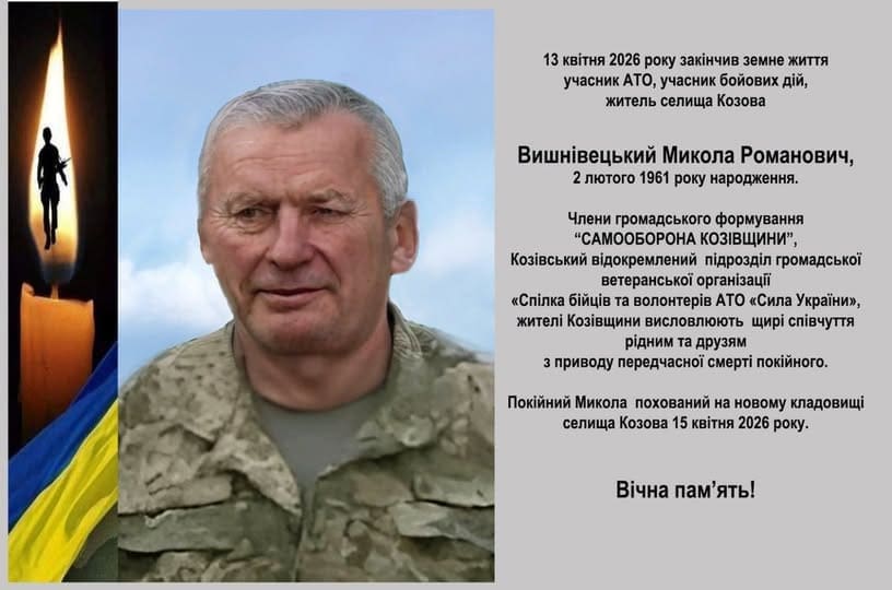 Микола Вишнівецький (20.02.1961) із Козови — учасник АТО та бойових дій — помер 13 квітня 2026 року. Члени громадського формування «Самооборона Козівщини» та Козівський підрозділ ветеранської організації повідомили про його смерть. Похований 15 квітня на новому кладовищі Козови.