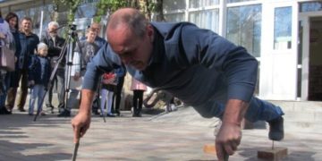 Не менш вражаючим був виступ мешканця Хоросткова Василя Шевчука. Він здійснив 39 відтискань від асфальту з опорою на ножі та цвяхи і також потрапив в Книгу рекордів Тернополя.