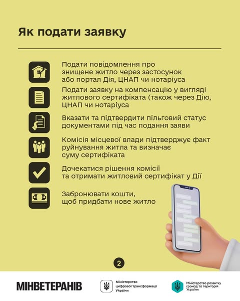 • ◾Подати заявку на компенсацію у вигляді житлового сертифіката (також через Дію, ЦНАП чи нотаріуса).